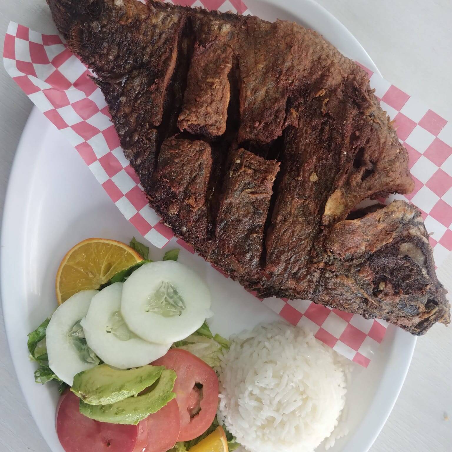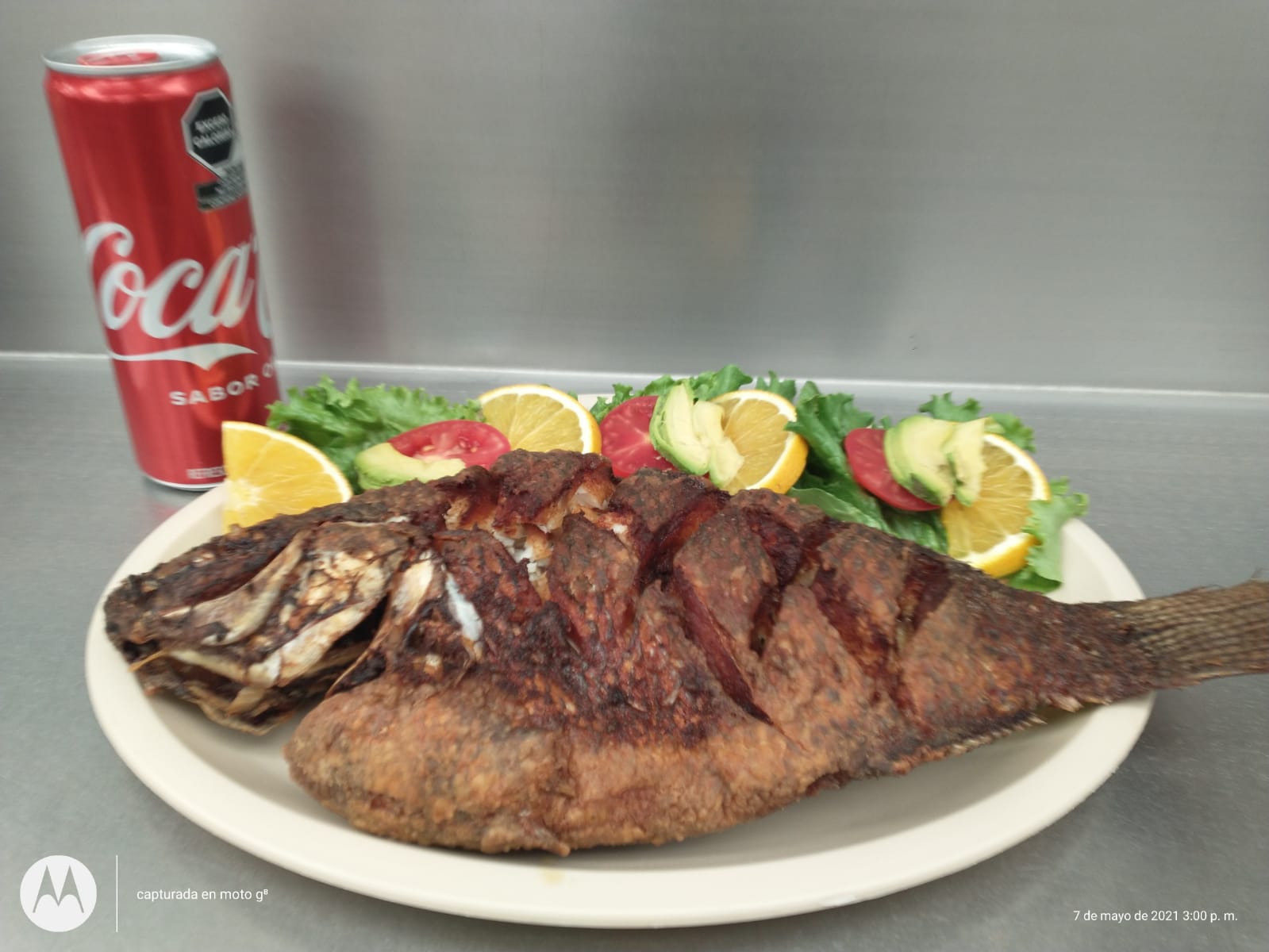 Mojarra de 1 kg aproximadamente pesada en crudo, frita, acompañada de ensalada (pepino, jitomate, lechuga y aguacate) y arroz blanco