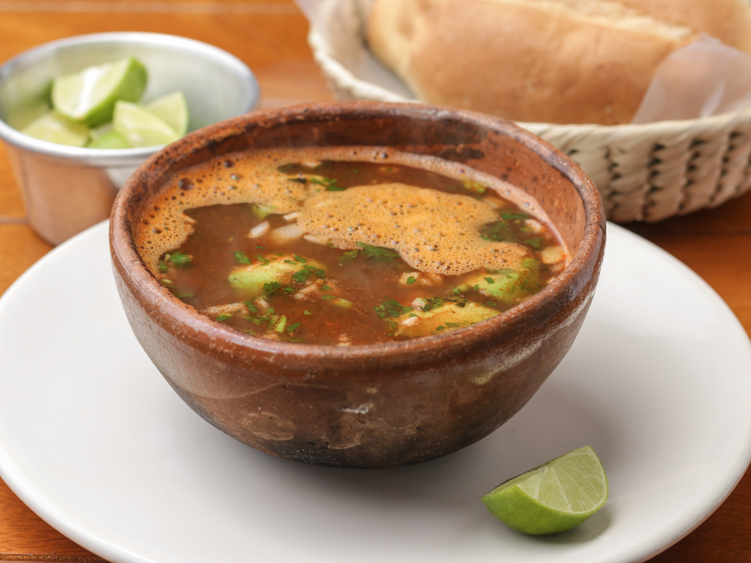 Consome de camaron con almejas, papa y zanahoria, preparado con cilantro, cebolla y aguacate. NOTA: No incluye camarones.