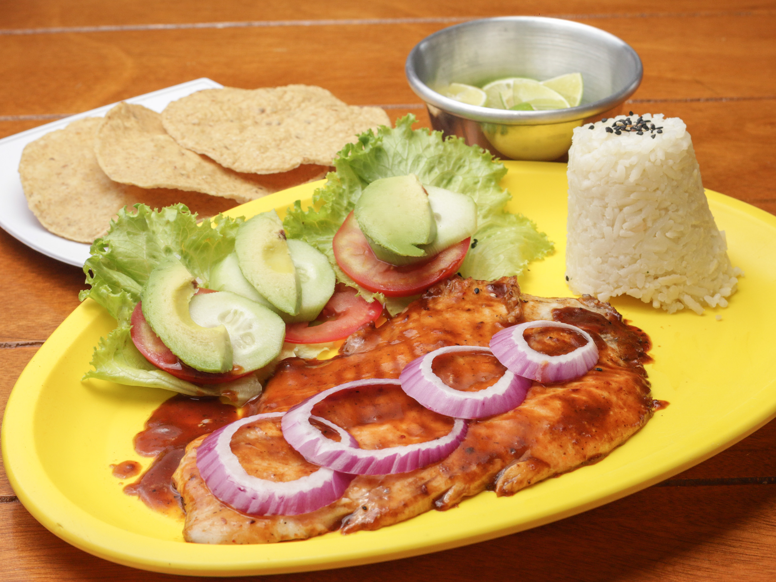 Sabana de Filete de pescado con ajo y chile guajillo, acompañado con ensalada y arroz.