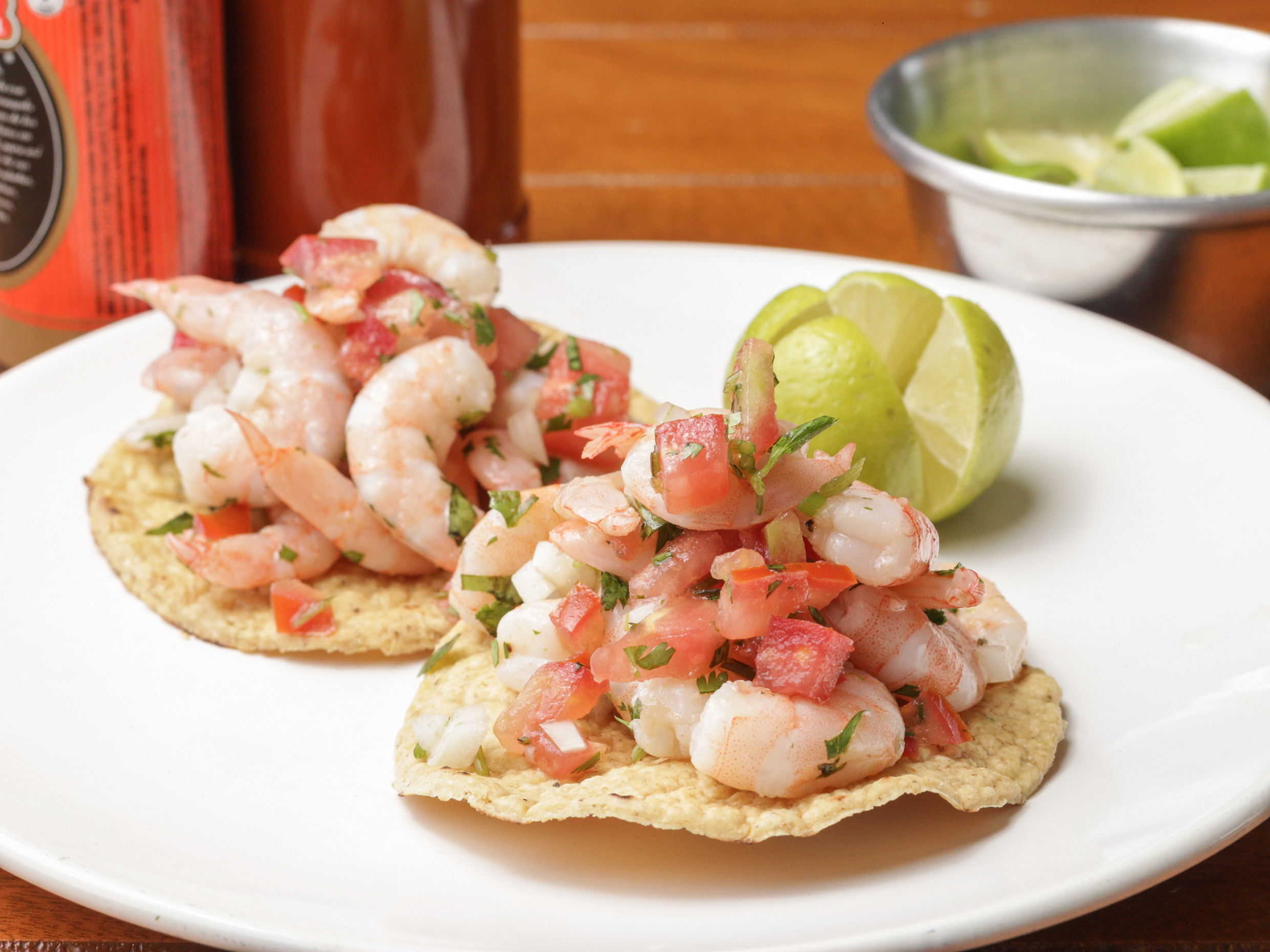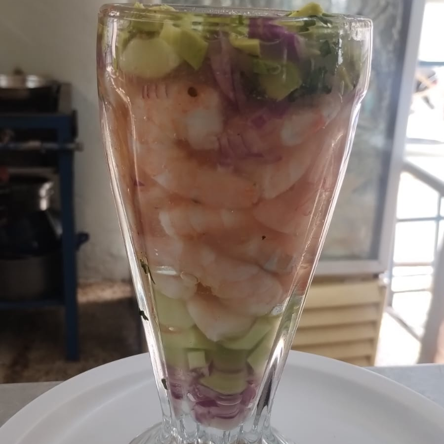 De camaron con ostion, con salsa catsup preparada, cilantro, cebolla y aguacate.