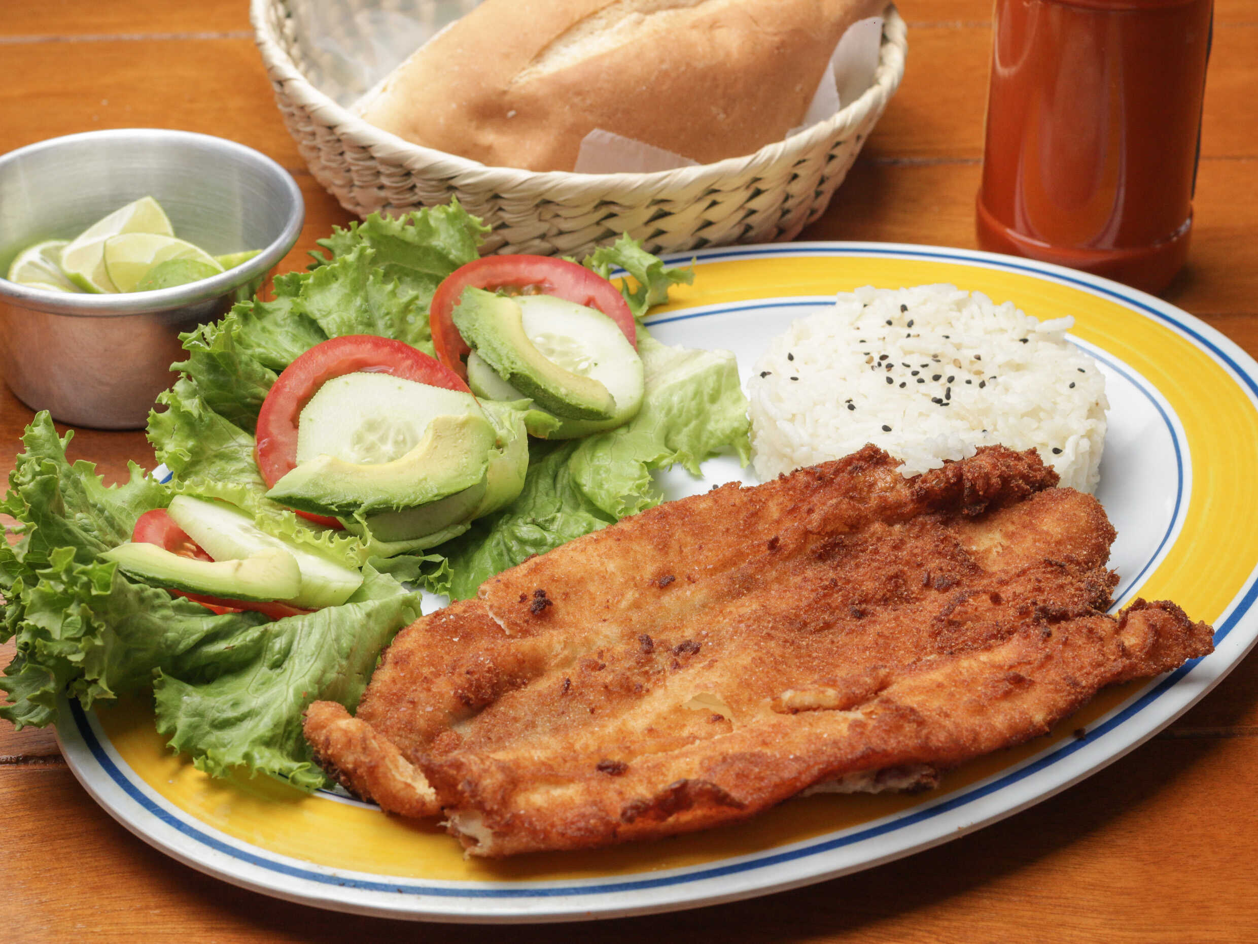 Filete empanizado relleno de camarón, jamón y queso. Servido con ensalada (lechuga, pepino, jitomate y aguacate) y arroz blanco.