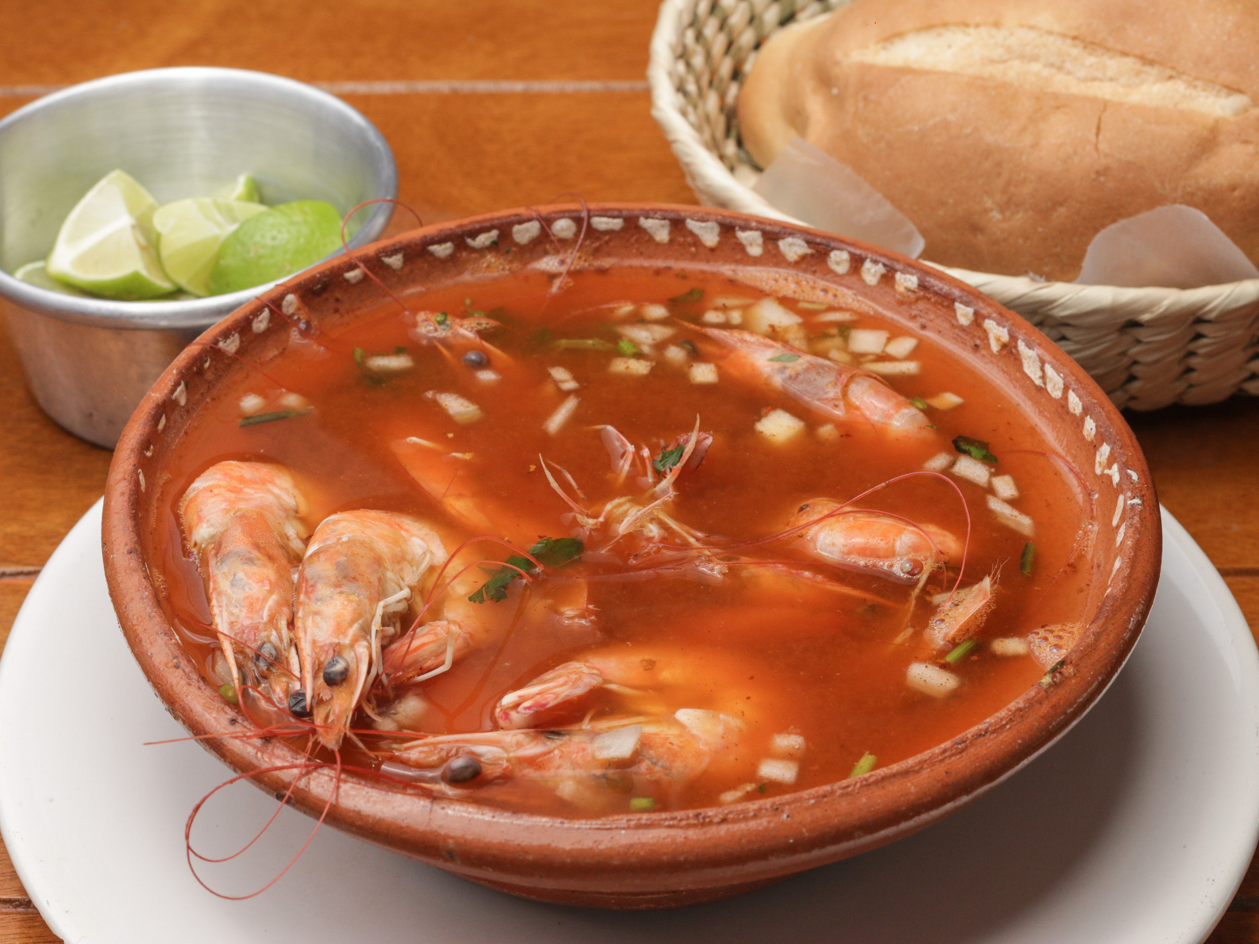 500ml Aprox de Caldo de camarón con camarones cocidos, almejas, papa y zanahoria, preparado con cilantro, cebolla y aguacate + limón y 1 pan bolillo + salsa valentina (Cubiertos)