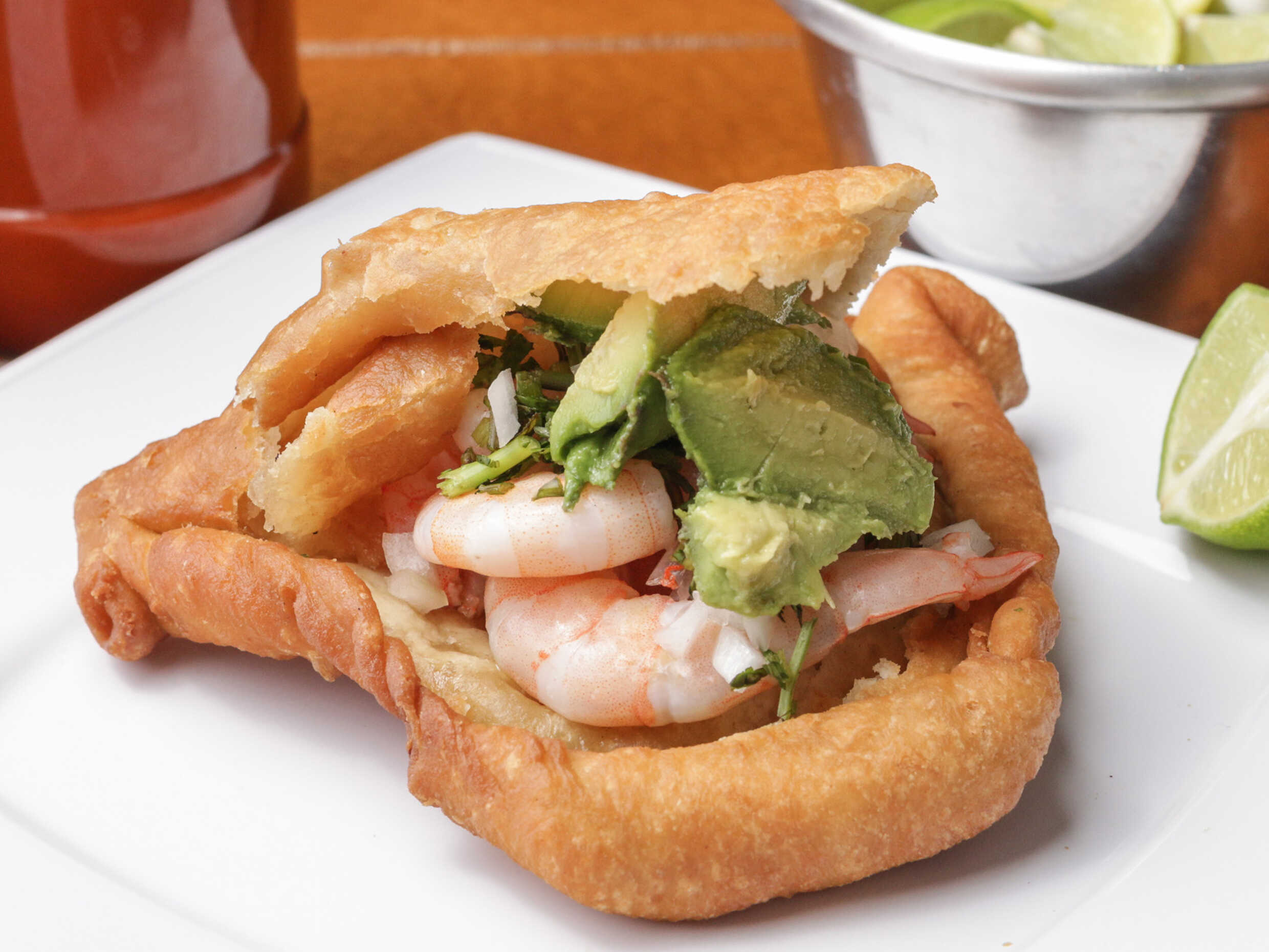 Quesadillas de camarón por 4 unidades acompañadas de guacamole.