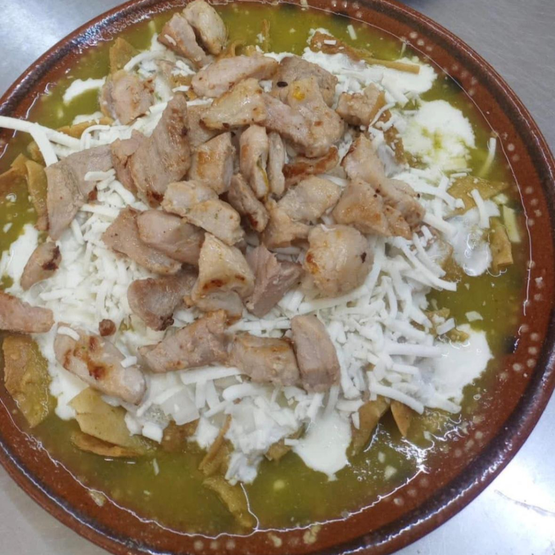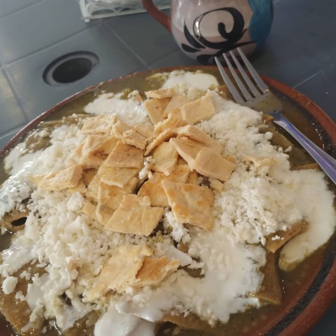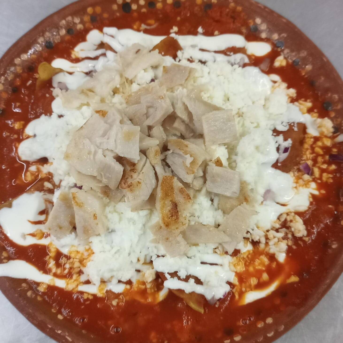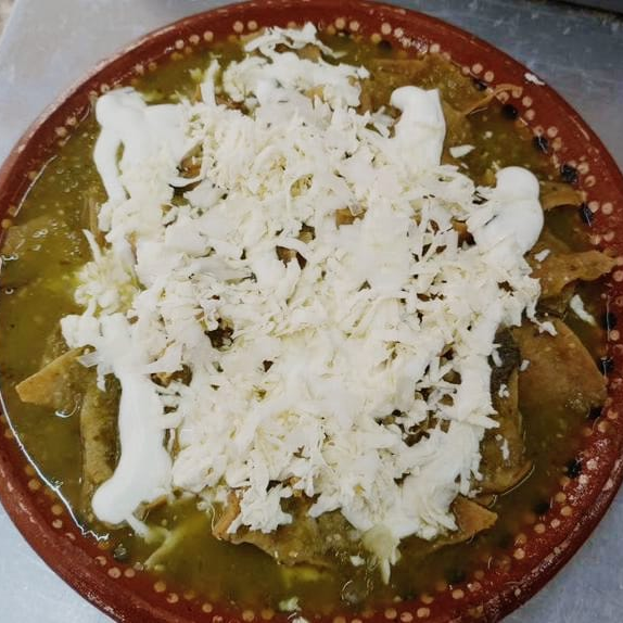 Orden de chilaquiles servidos con crema, queso y cebolla.
