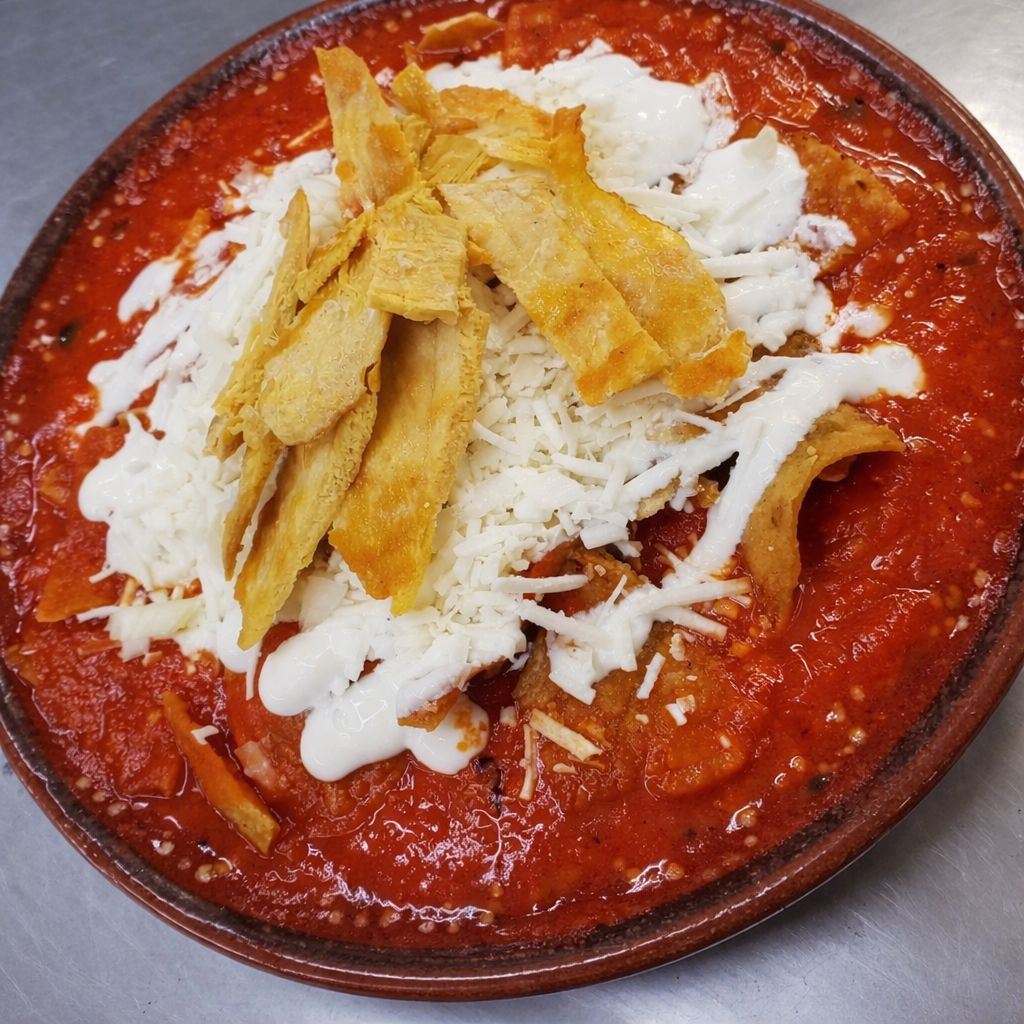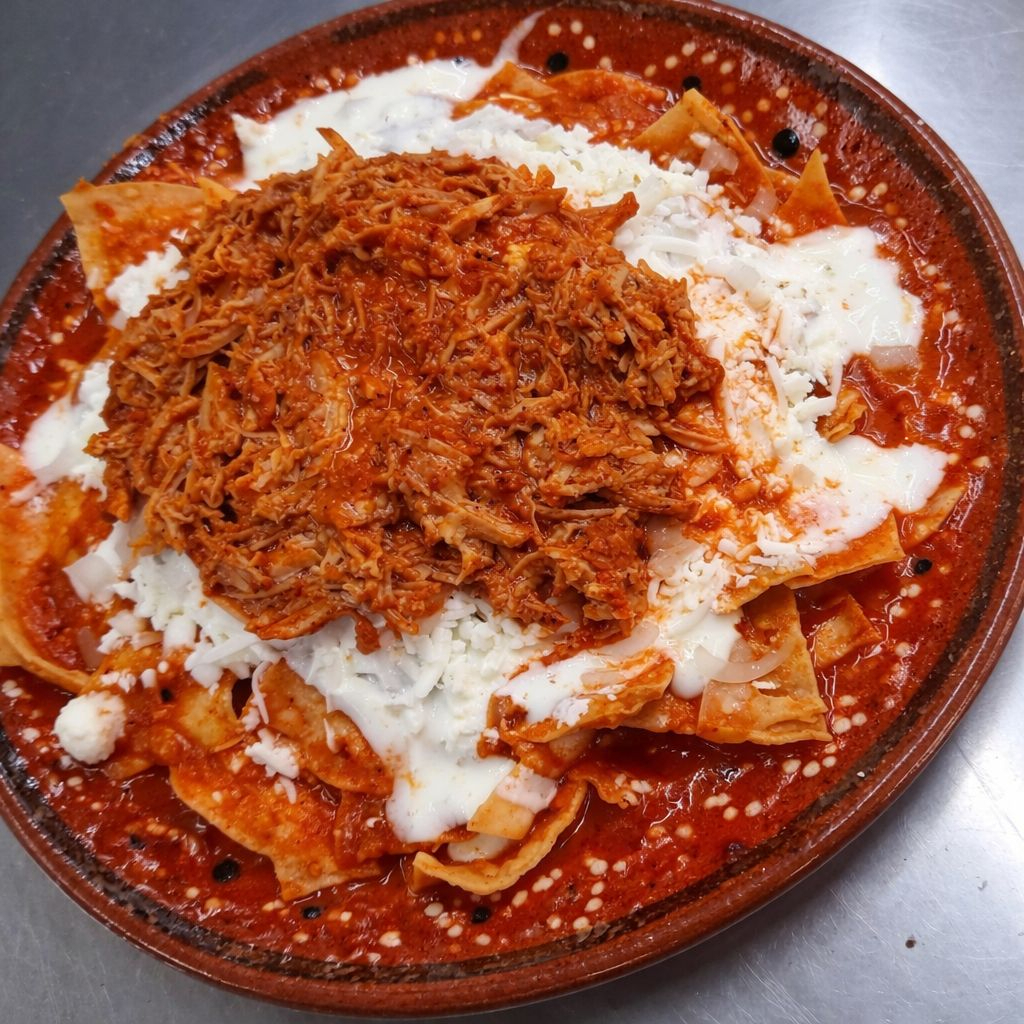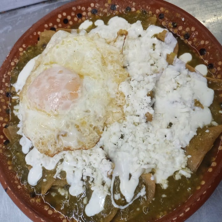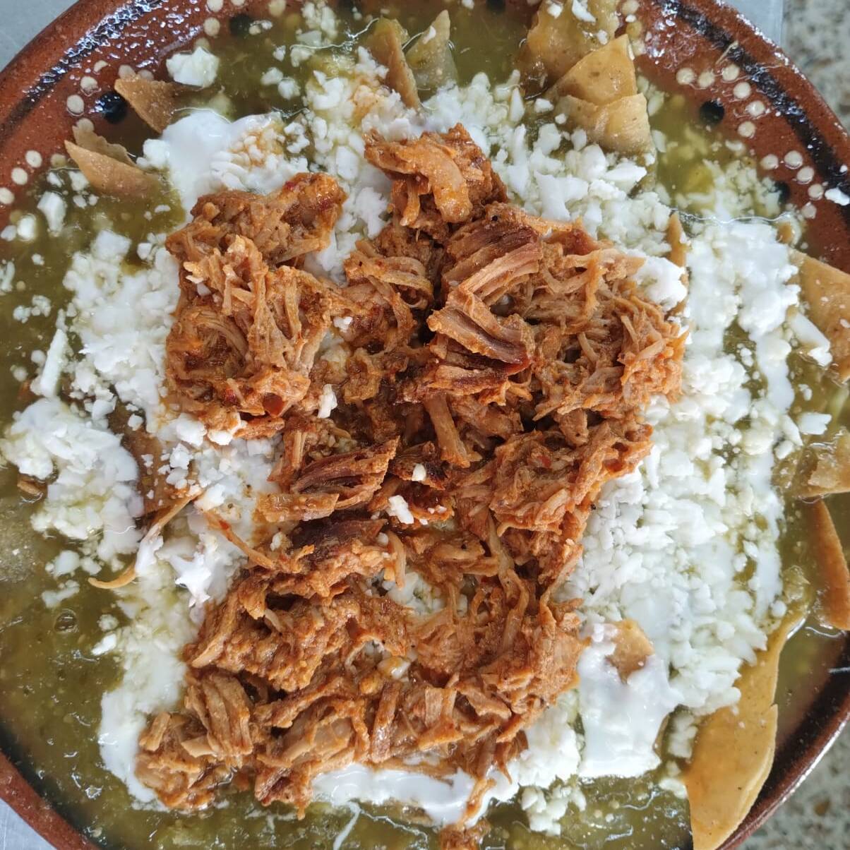 Orden de chilaquiles servidos con crema, queso y cebolla.