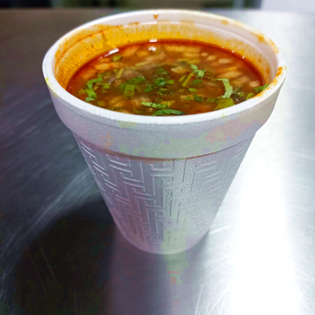 Nota: No incluye camarones, solo es el sabor del consome. Con cilantro, cebolla, aguacate, papa y zanahoria. 8 onzas.