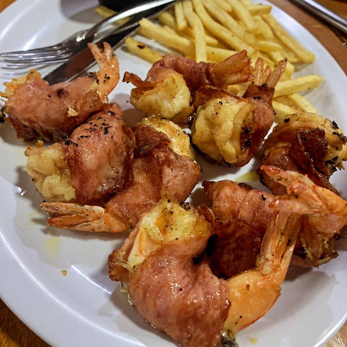 8 camarones salteados envueltos en crujiente tocino y rellenos de queso gouda acompañados de papas a la francesa