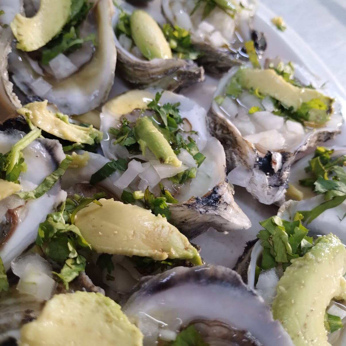 Ostiones en su concha preparados con aceite de oliva, aguacate,cebolla y cilantro