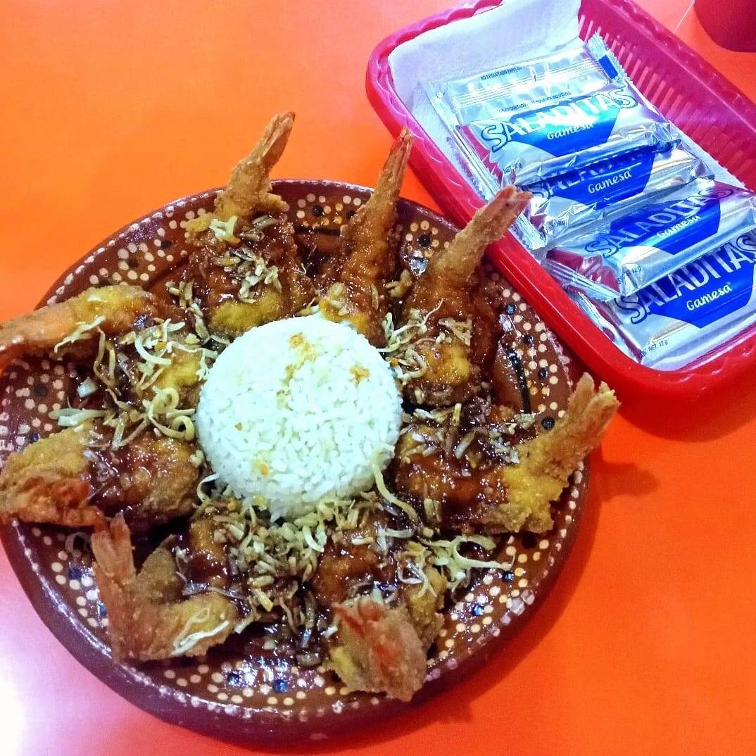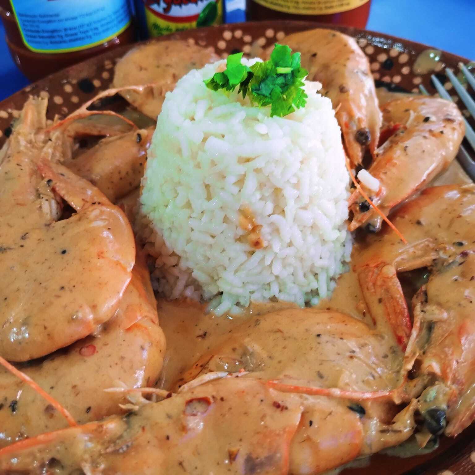 8 Camarones emapanizados, espolvoreados con coco crujiente, bañados en deliciosa salsa de tamarindo acompañado con arroz.