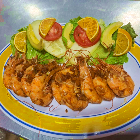 8 camarones grandes salteados en mantequilla y dorados con ajo picado acompañados de ensalada.