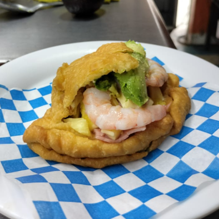 Empanada hecha en casa, con 75 gramos de camaron, jamon, queso, piña y aguacate.
