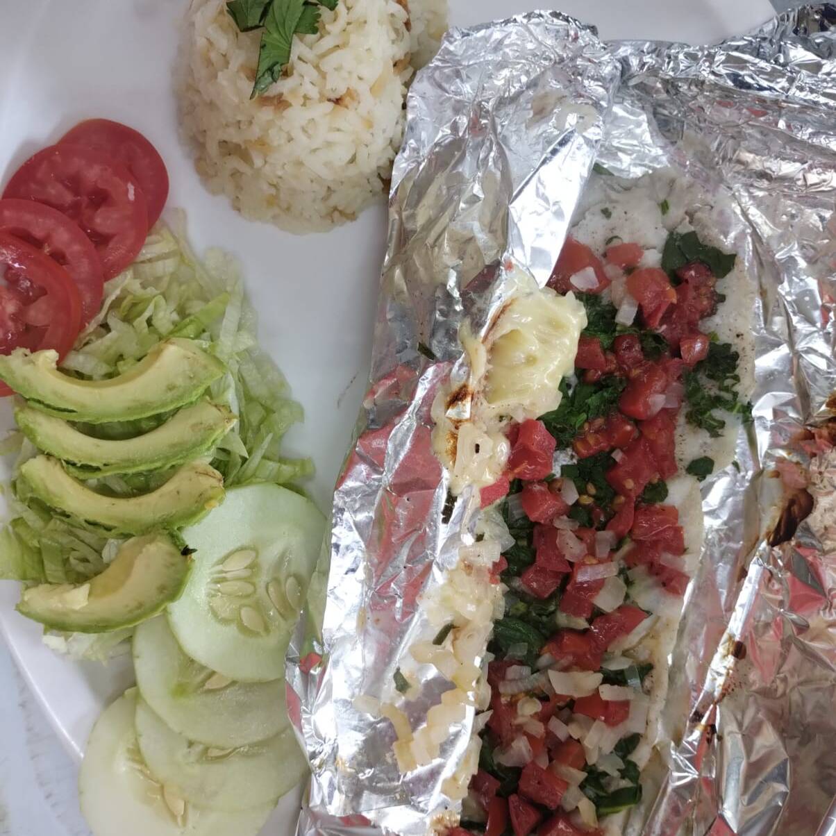 Sabana de pescado envuelta en papel aluminio con camarón, queso gouda, cebolla, jitomate, epazote, y un toque de salsa de chipotle con mayonesa. Servido con ensalada (lechuga, pepino, jitomate y aguacate) y arroz blanco