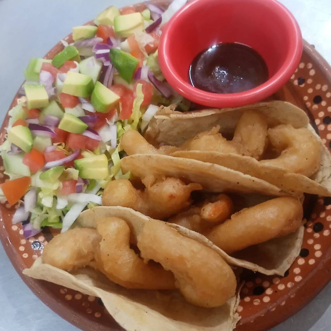 Orden de 3 tacos de camaron capeado, acompañado con jitomate, cebola morada, aguacate y aderezo de la casa.