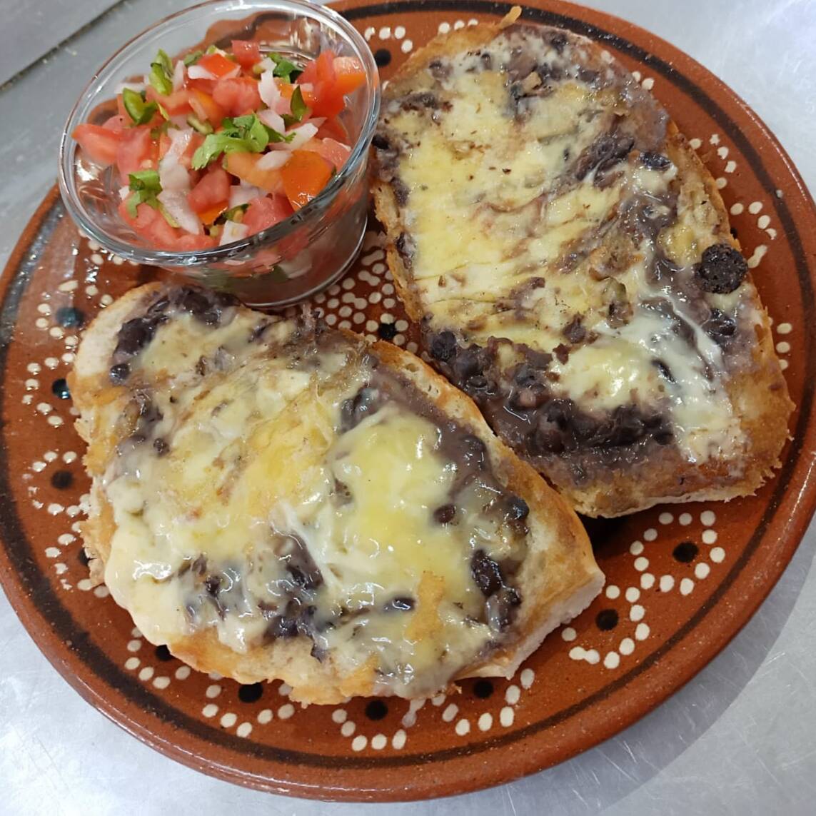 Molletes con basse de frijoles y queso gratinado, acompañados de pico de gallo