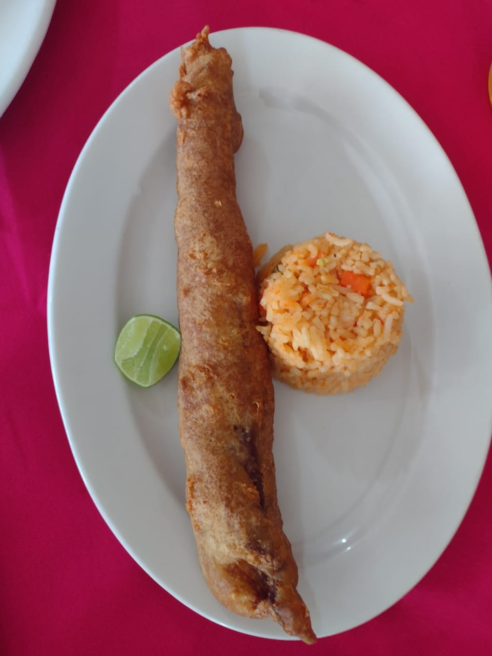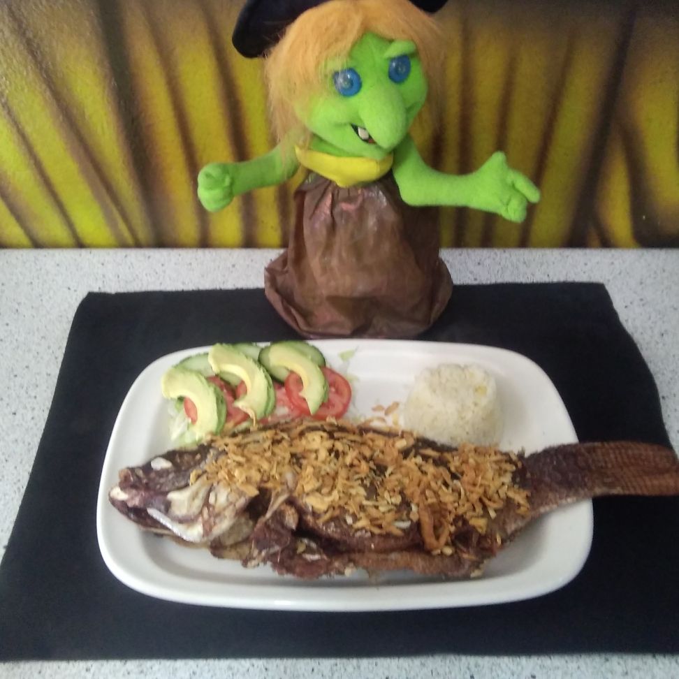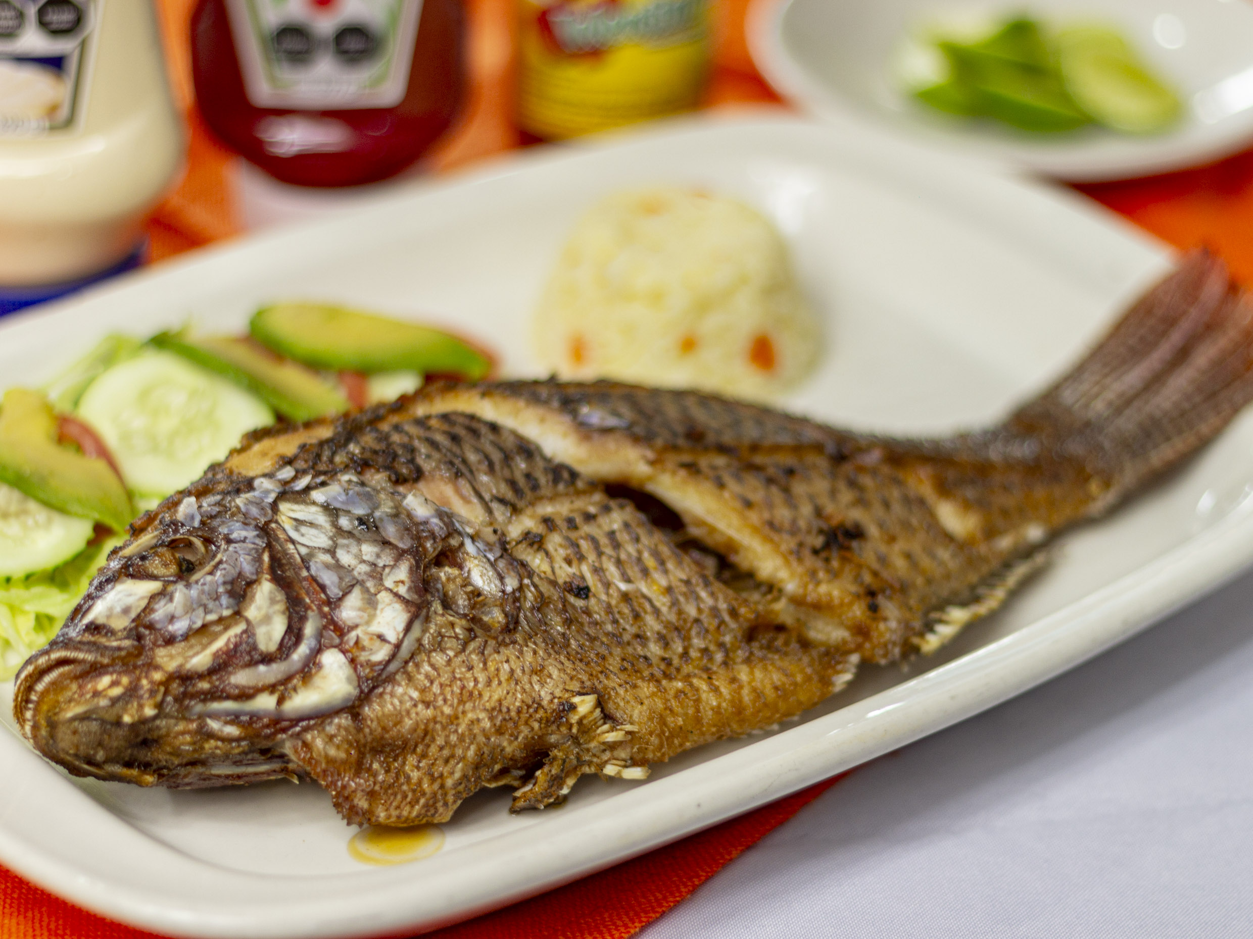 Mojarra chica 500gms. Cóctel chico de camarón, Coca Cola, sangría señorial o manzana.