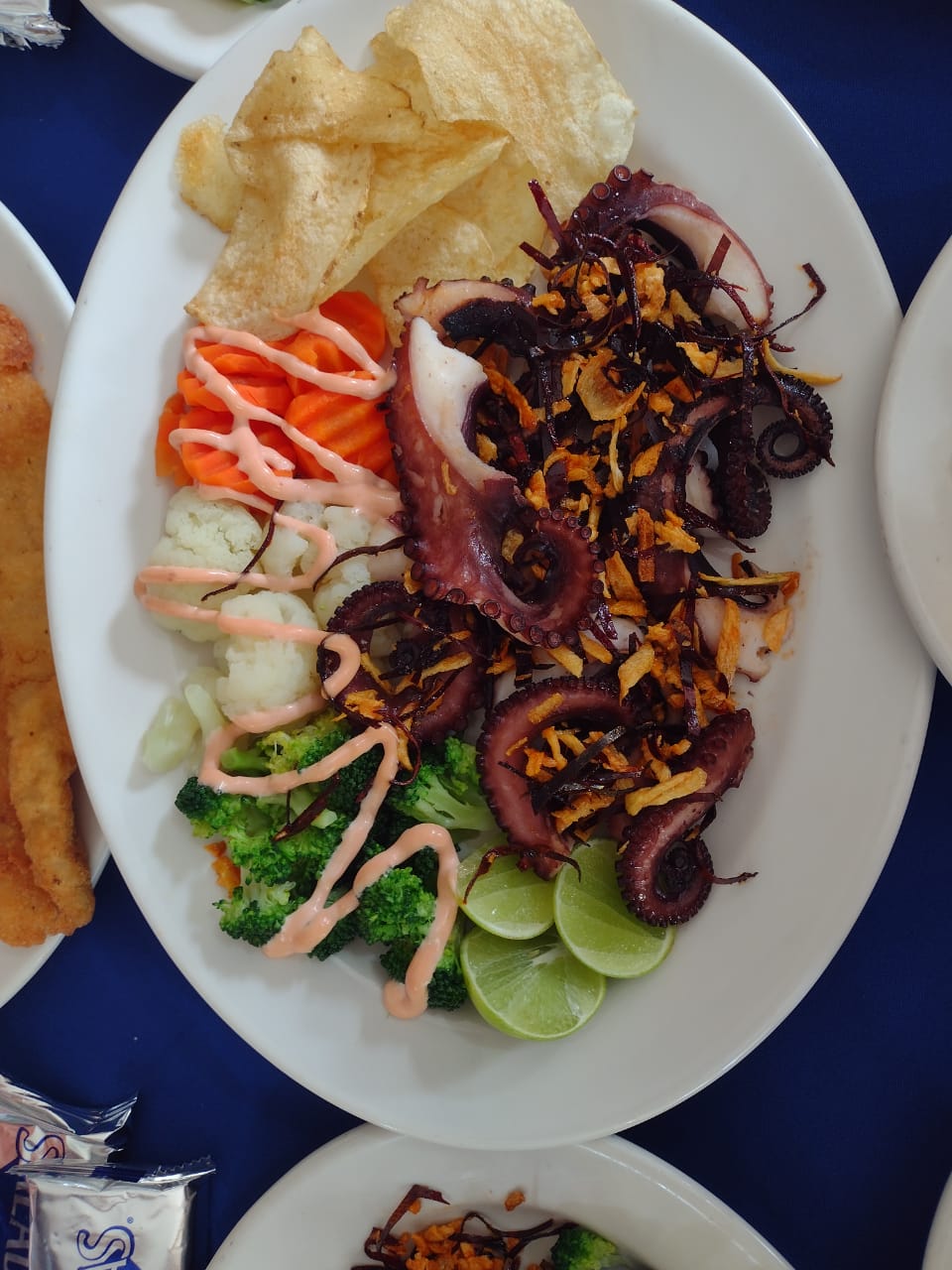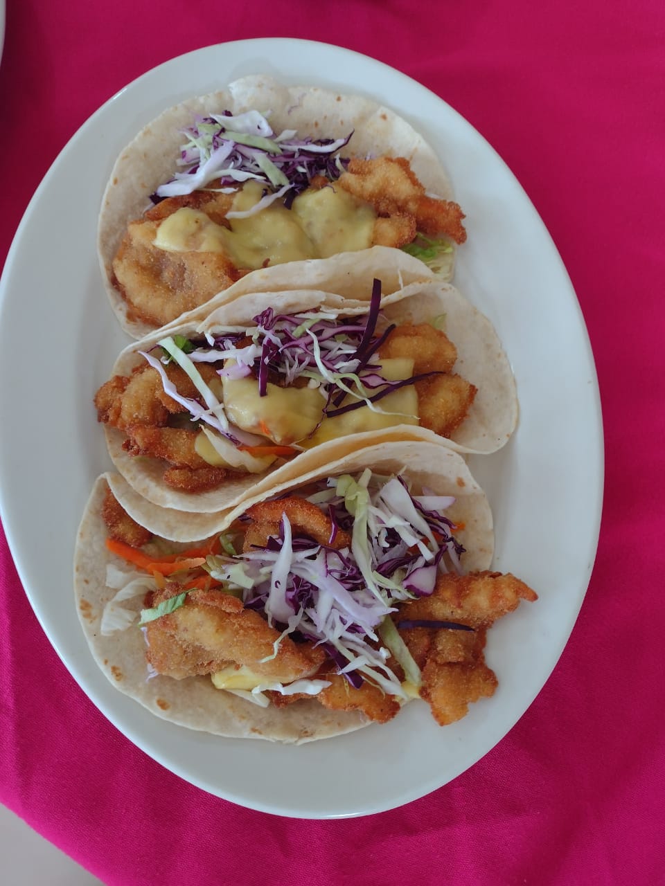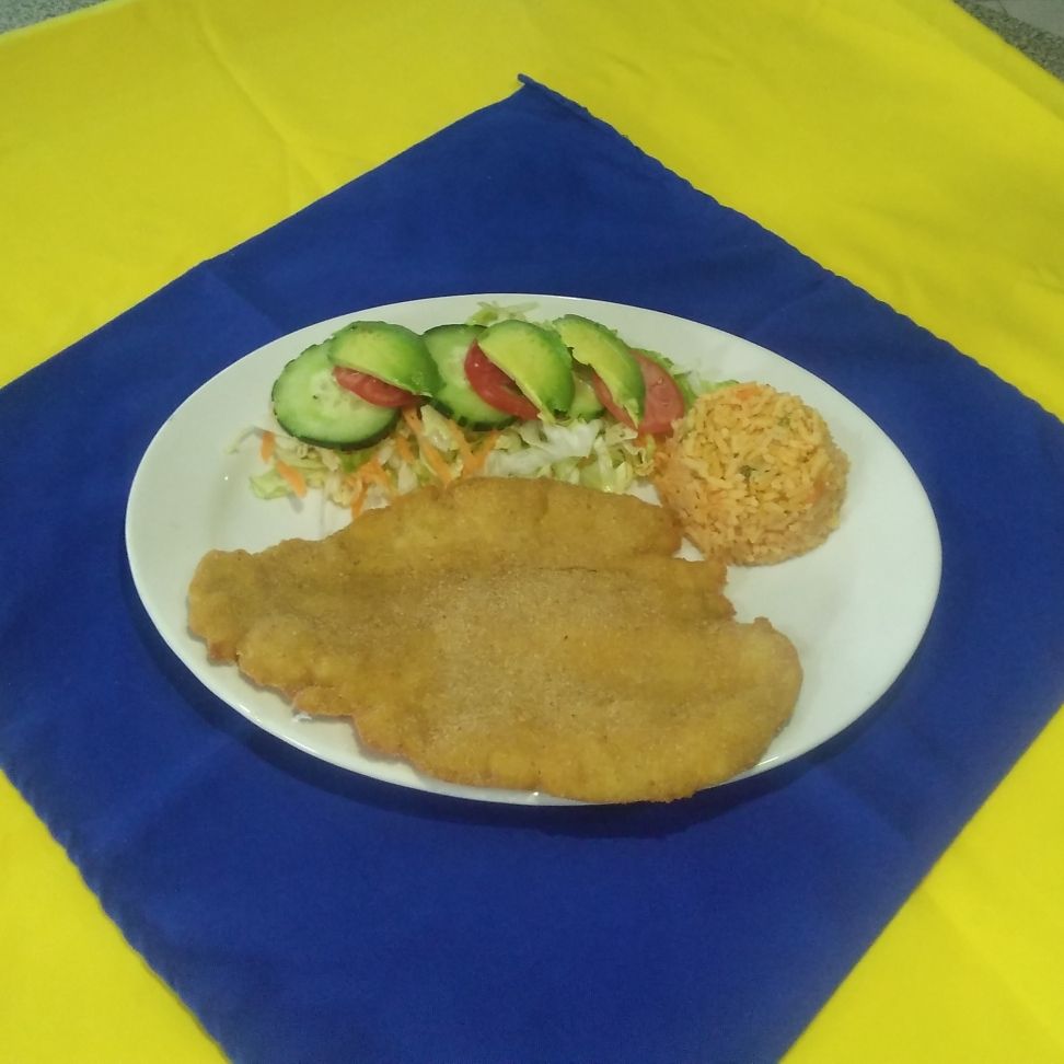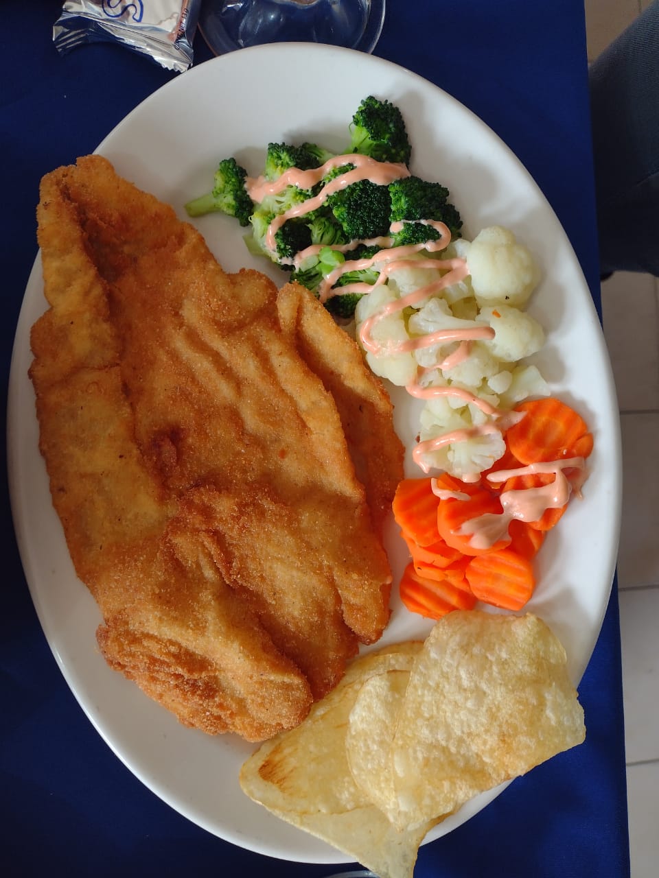 Filete de pescado empanizado, empanada de camarón, Coca Cola de 355 ml. Sangría o extrapoma de manzana.