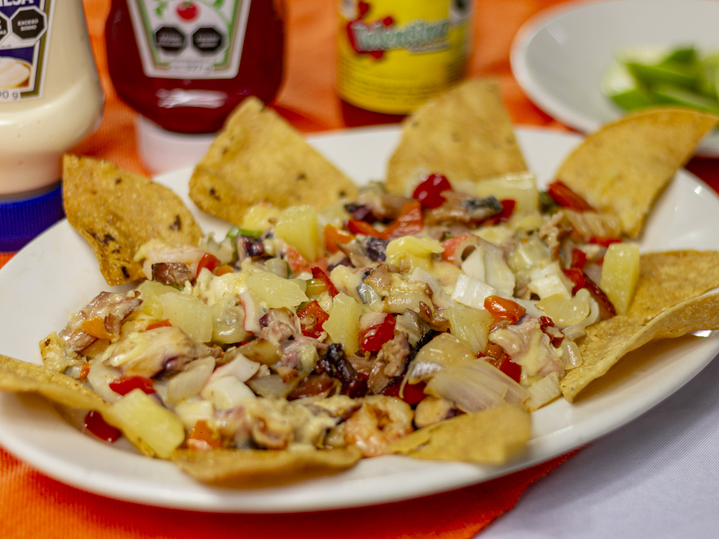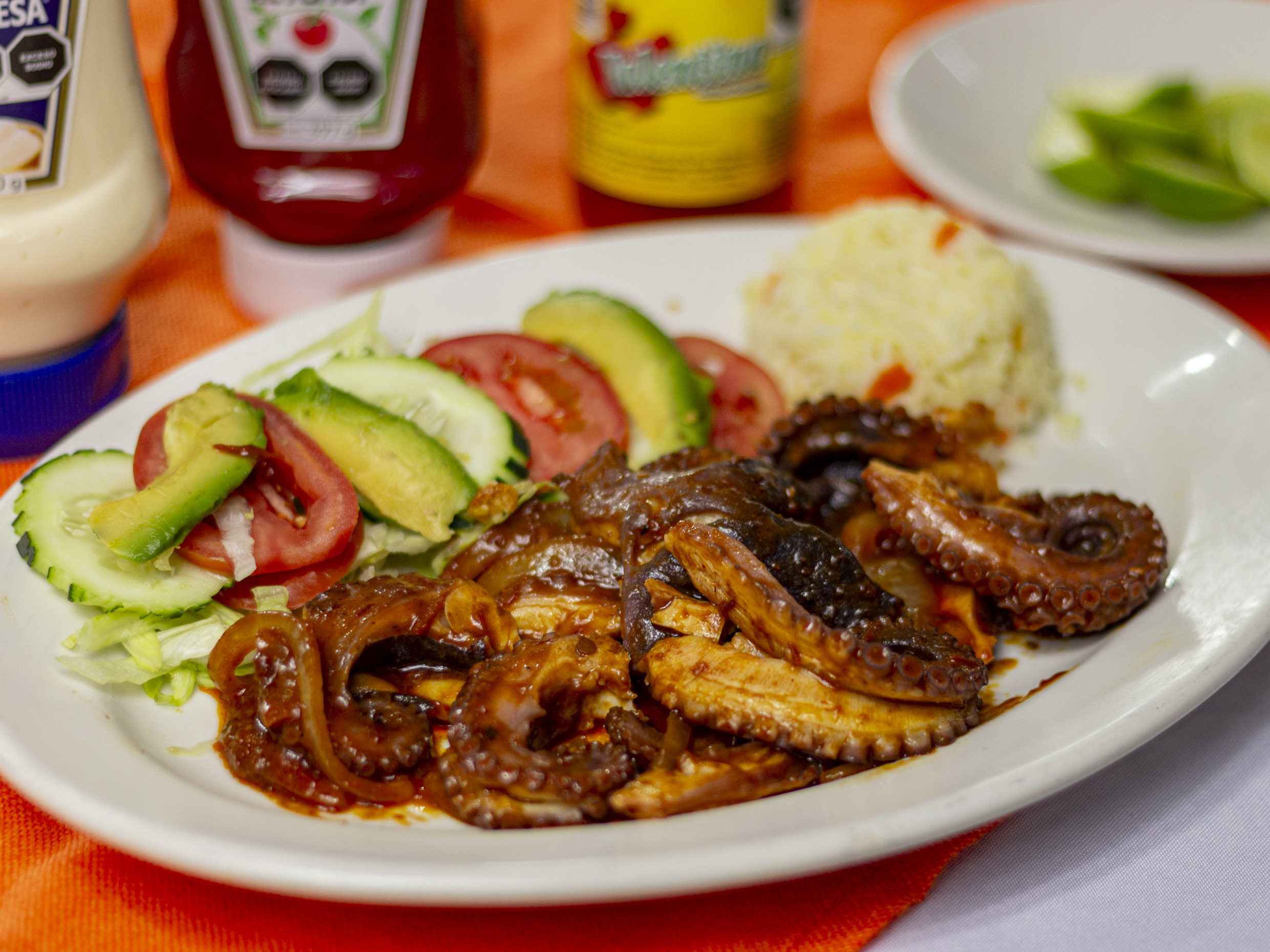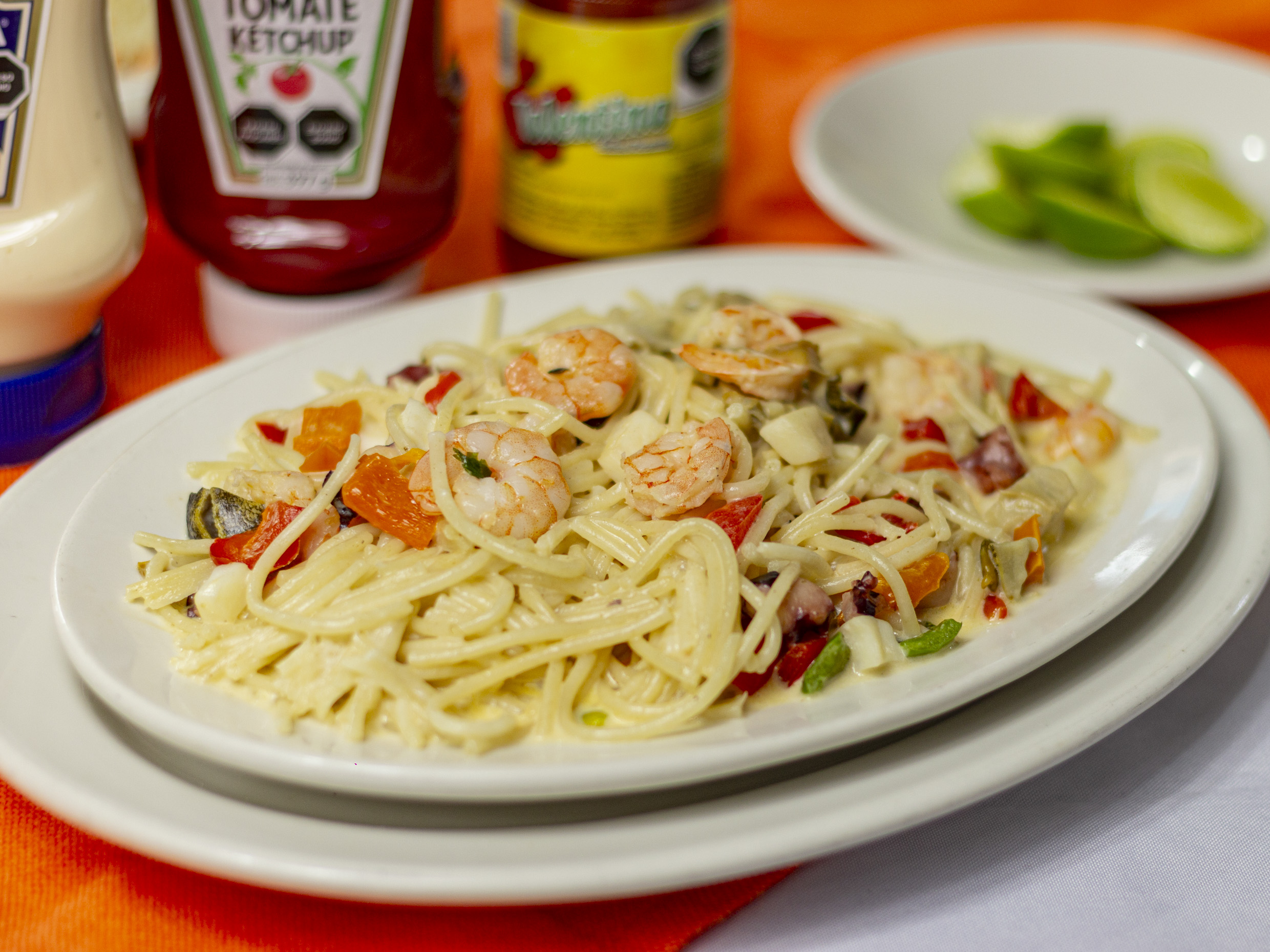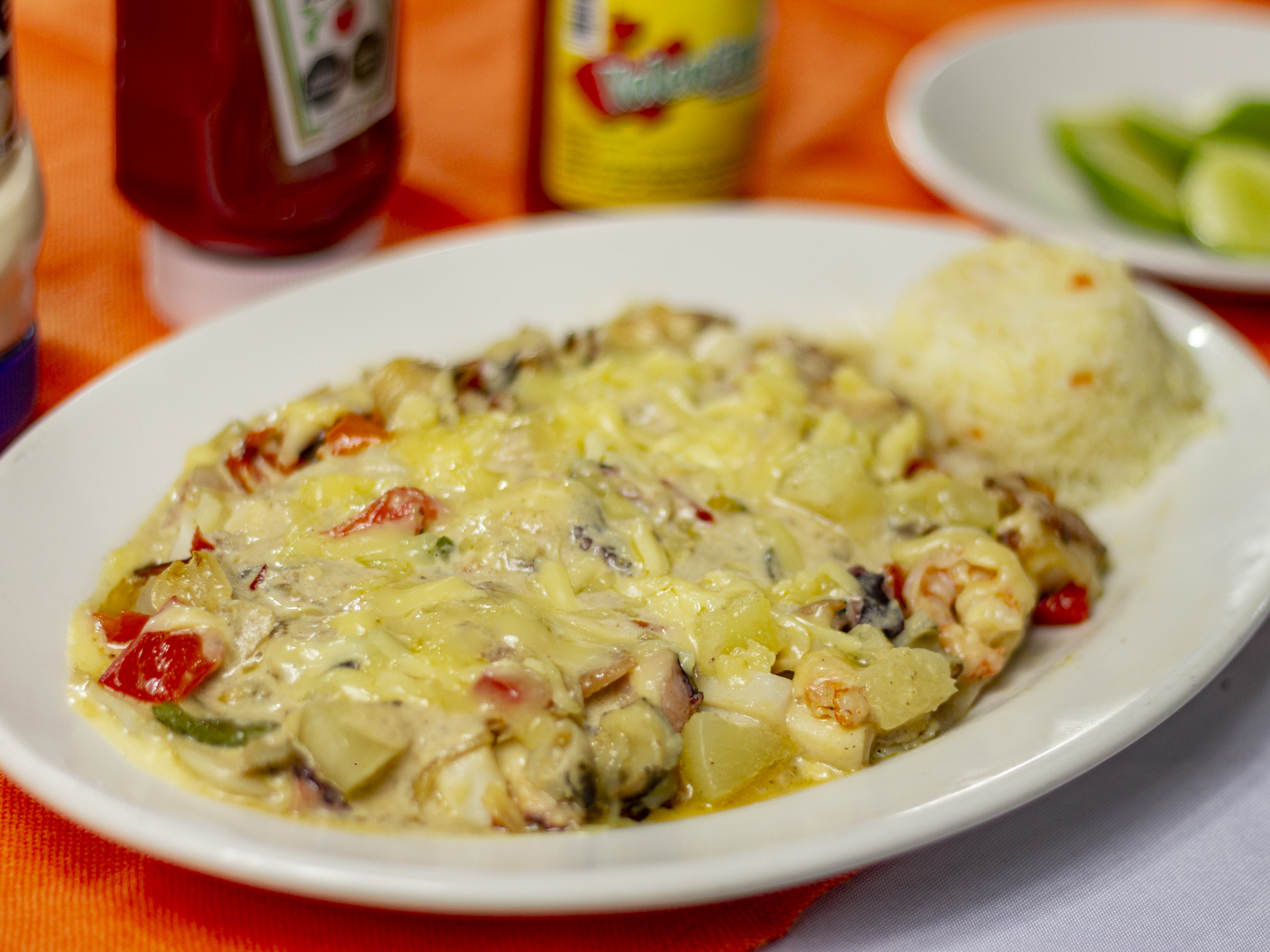 Pulpo, camarón, calamar, caracol, ostión y surimi con crema de champiñones gratinado con queso manchego.