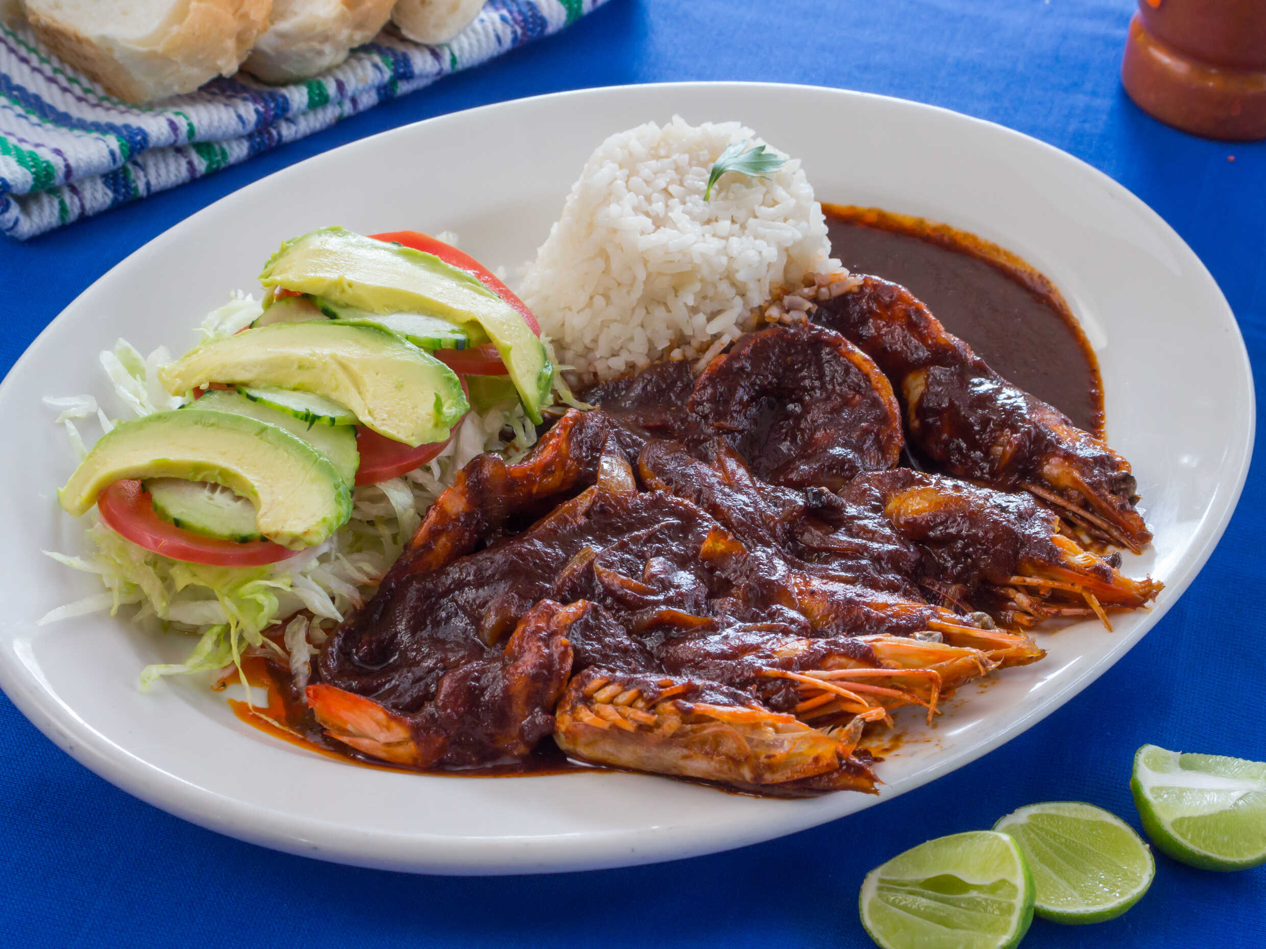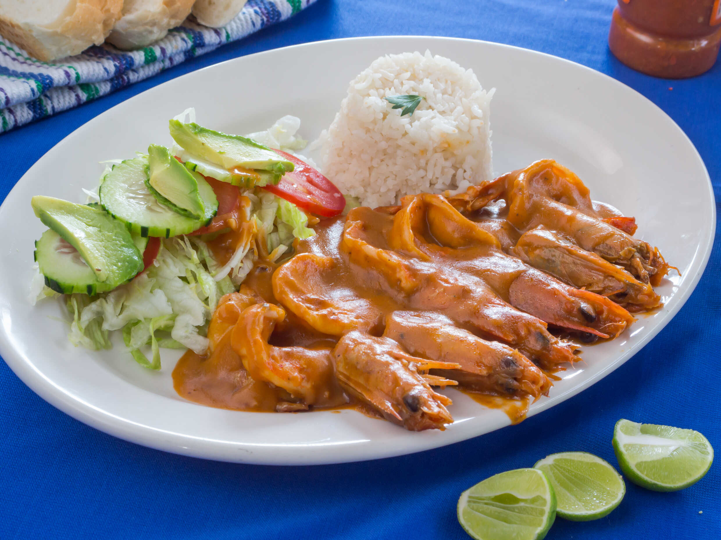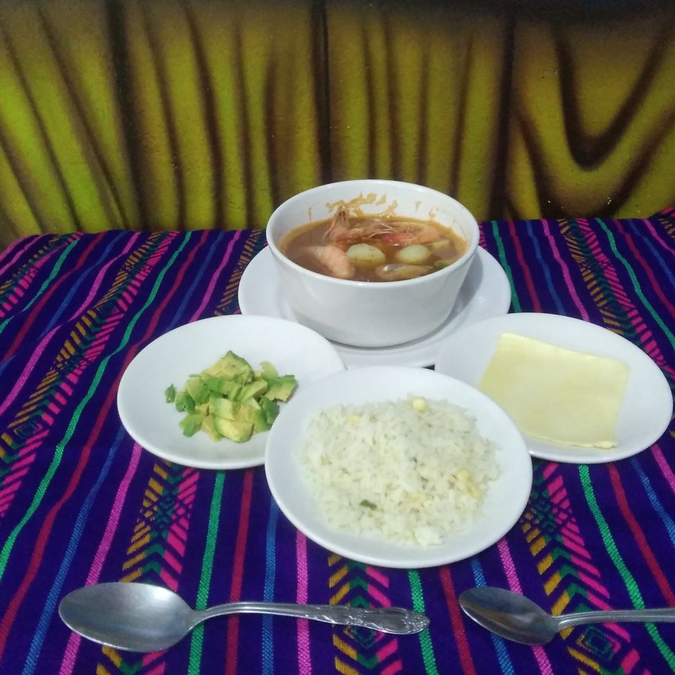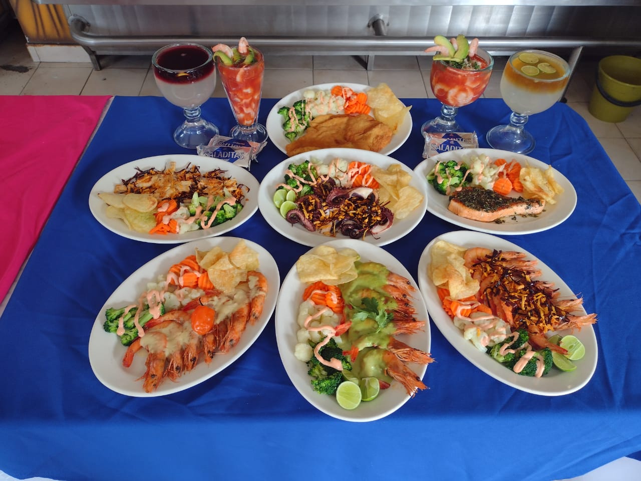 Empanada de camarón, filete mar y tierra, chongos, duraznos, pie de limón o flan.