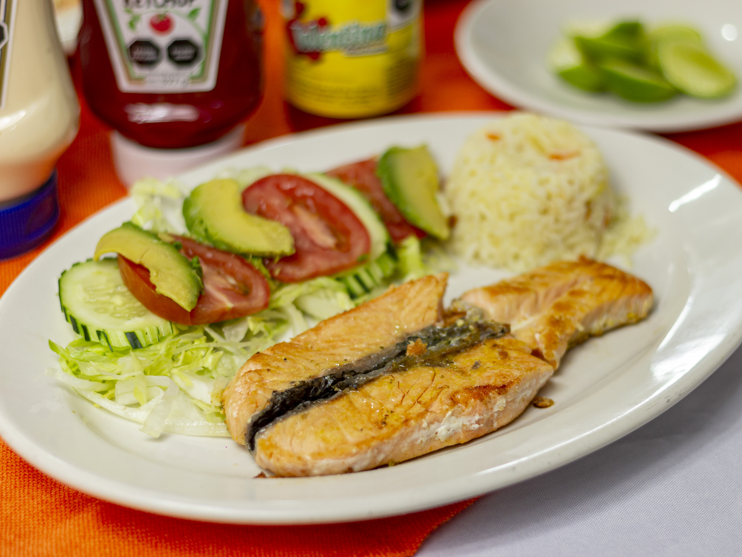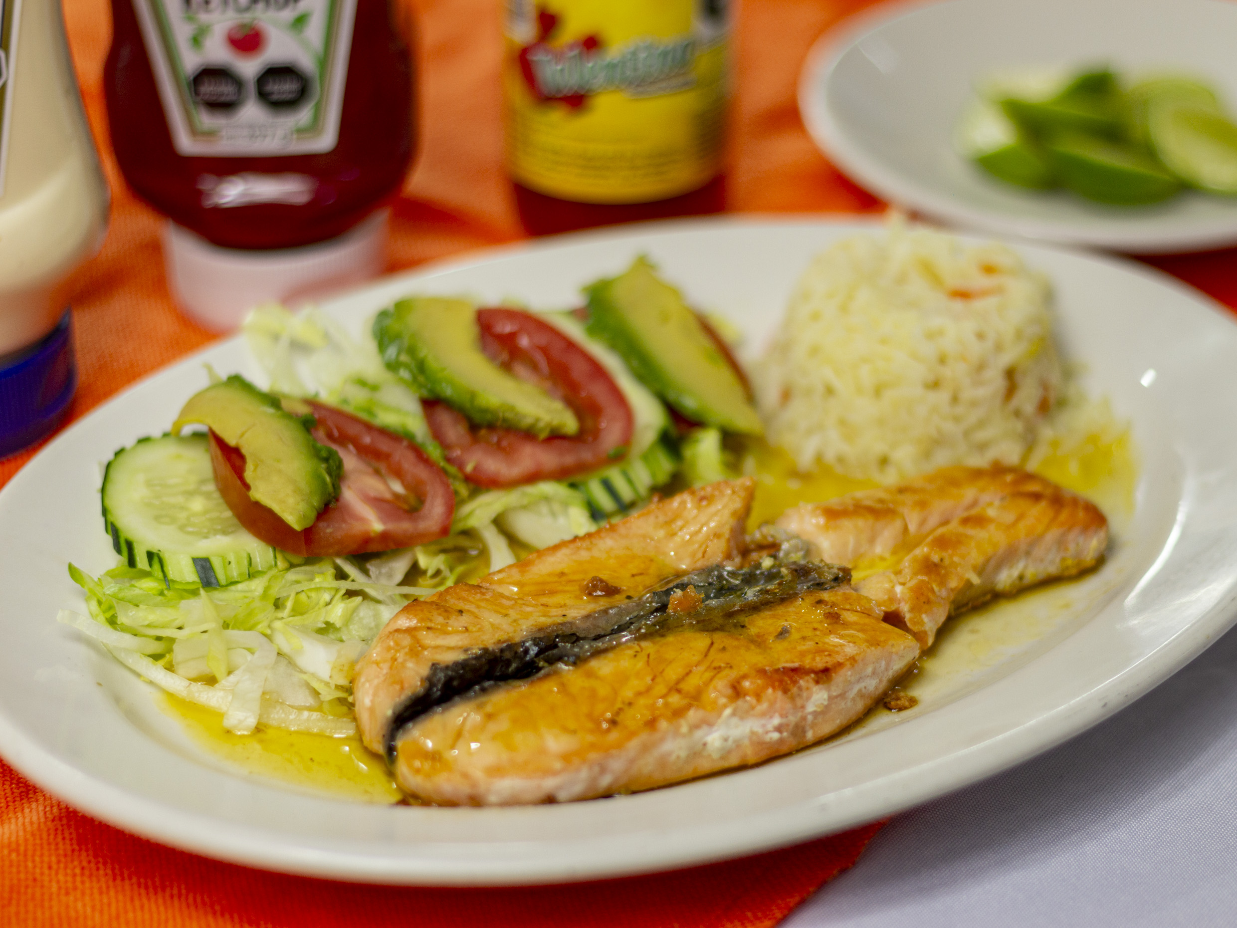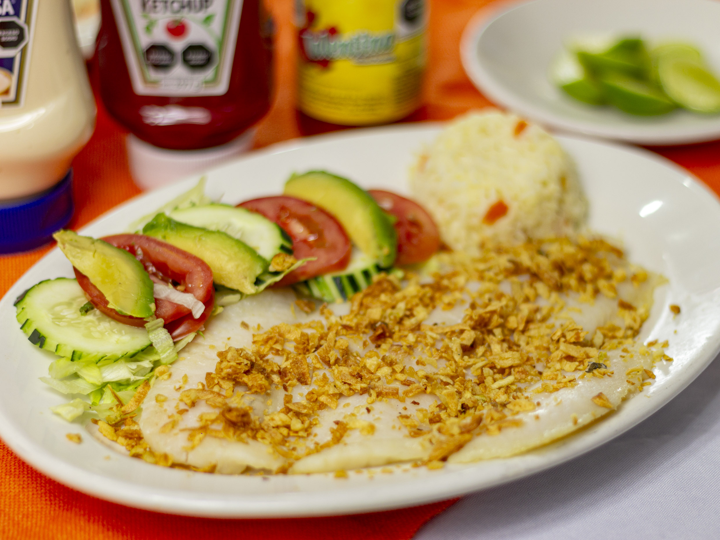Coctel chico, mojarra al gusto frita, ajillo o diabla, duraznos, flan o pie de limón.