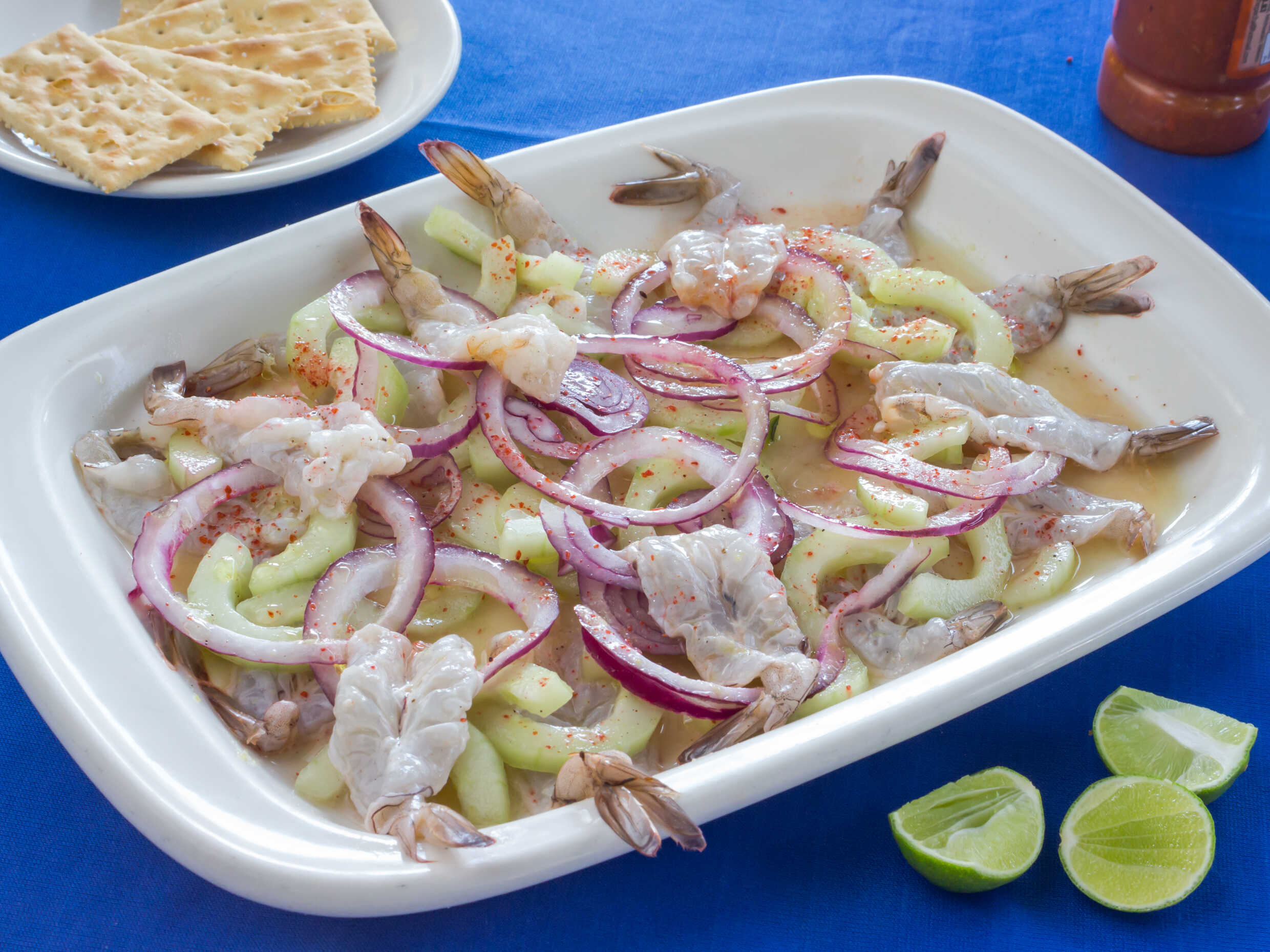 Cóctel de Camarón Mediano de 12 onzas aprox, Cátsup, aguacate, cebolla, cilantro y aceite de olivo.