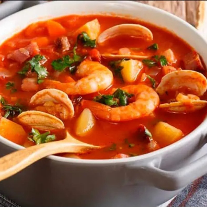 Caldo de camarón con almeja, camarones para pelar, papa y zanahoria.