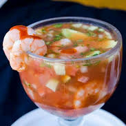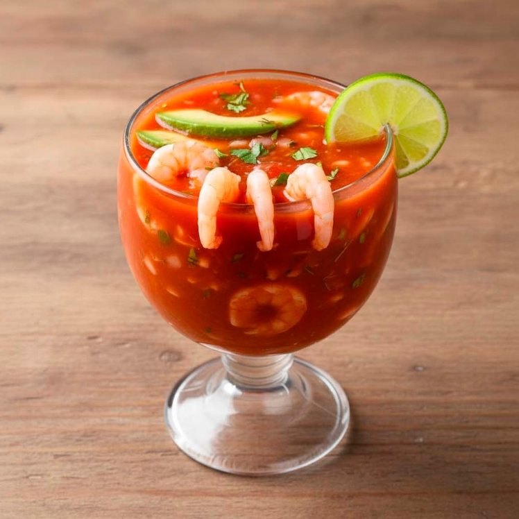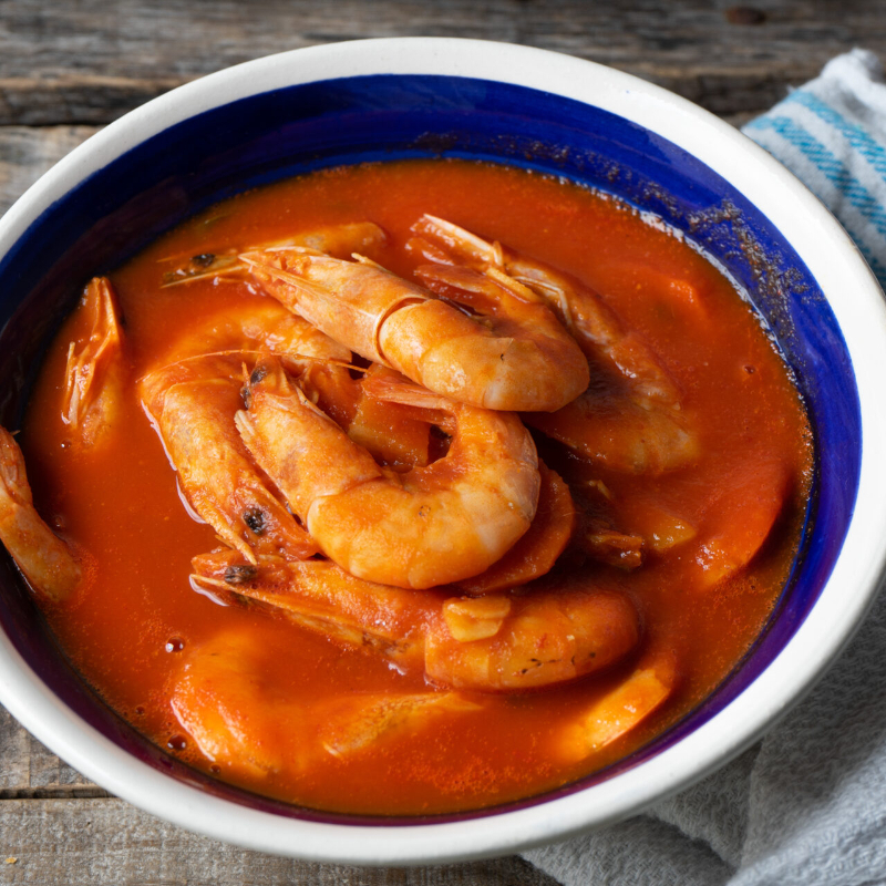Caldo de camarón con pulpo, almeja, calamar, tsurimi y camarones para pelar, acompañada de queso.