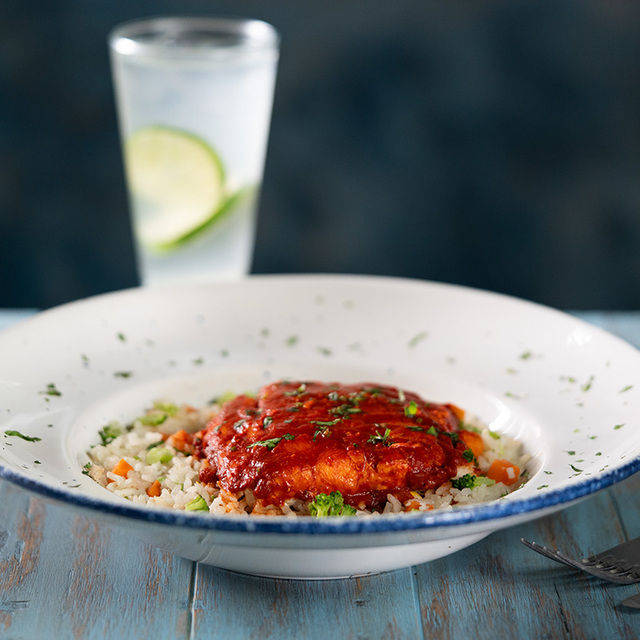 Acompañado con una guarnición de ensalada, papas y arroz.