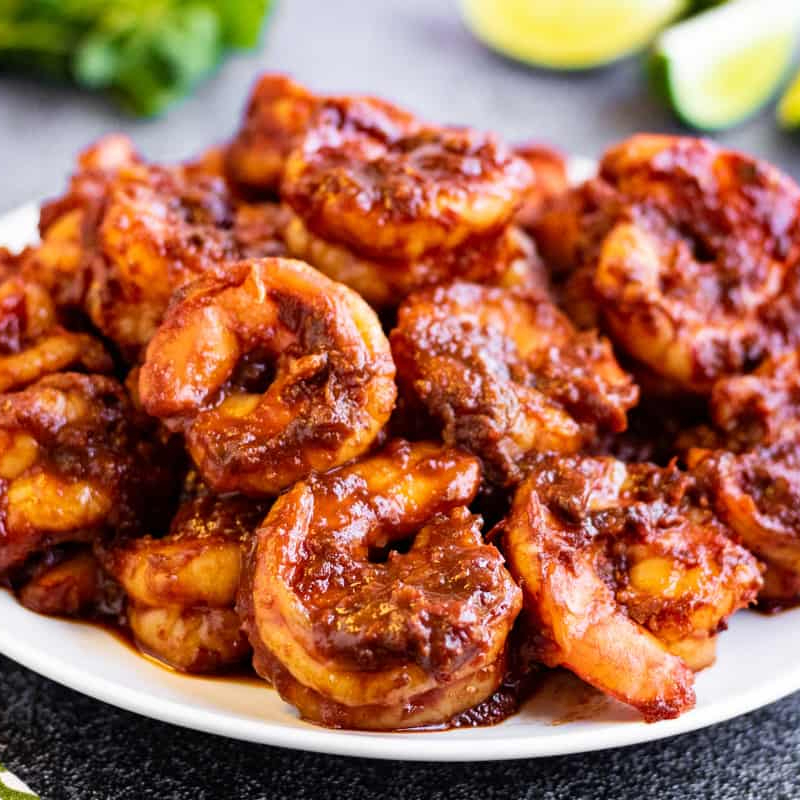 Camarones salteados con pimientos, cebolla, queso y tortillas de harina.