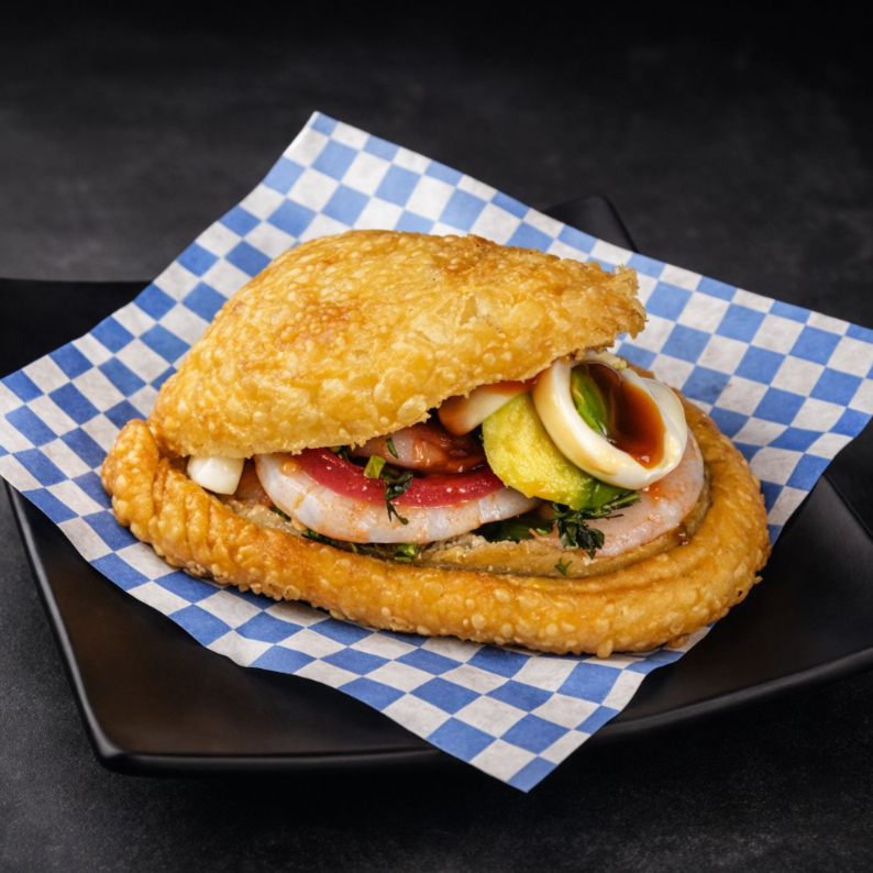 Tortilla de harina rellena de frijoles, queso y camarón, pulpo, calamar, surimi y ostión.
