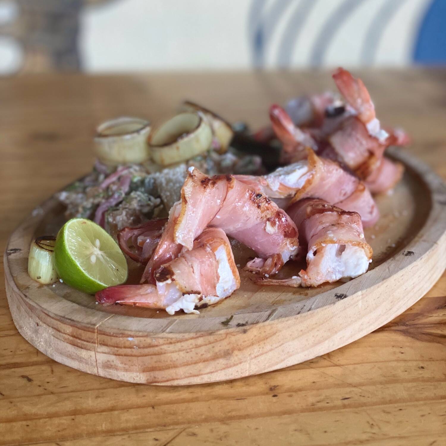 8 Piezas de camarón mojo rellenos de queso cremo envueltos de tocino con guarnición de arroz y ejotes de la casa.