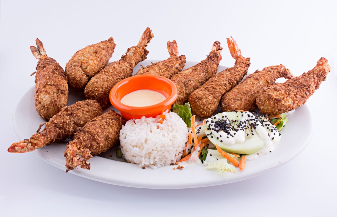 8 Piezas de camarón mojo relleno de queso crema, empanizado con ajonjolí y coco, guarnición de arroz y papas rústicas.