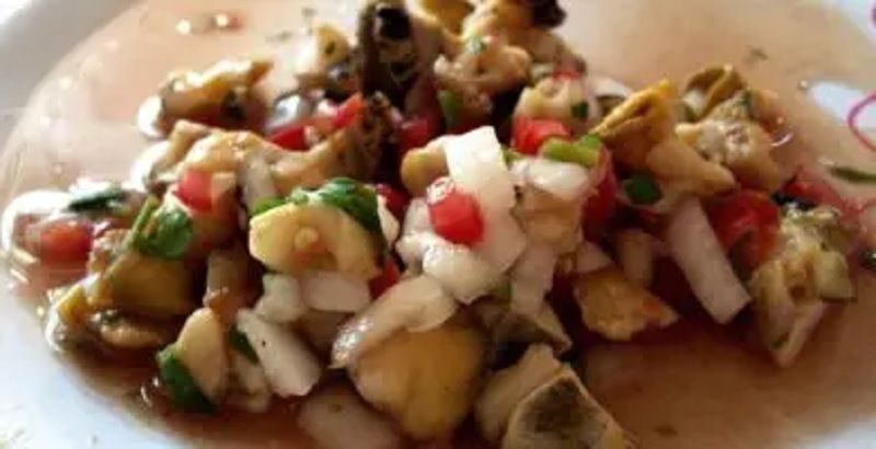 Ceviche con pulpo, jaiba, caracol, camaron, filete mero, cebolla, jitomate, aguacate, chile guajillo, chile cuaresmañoy queso oaxaca