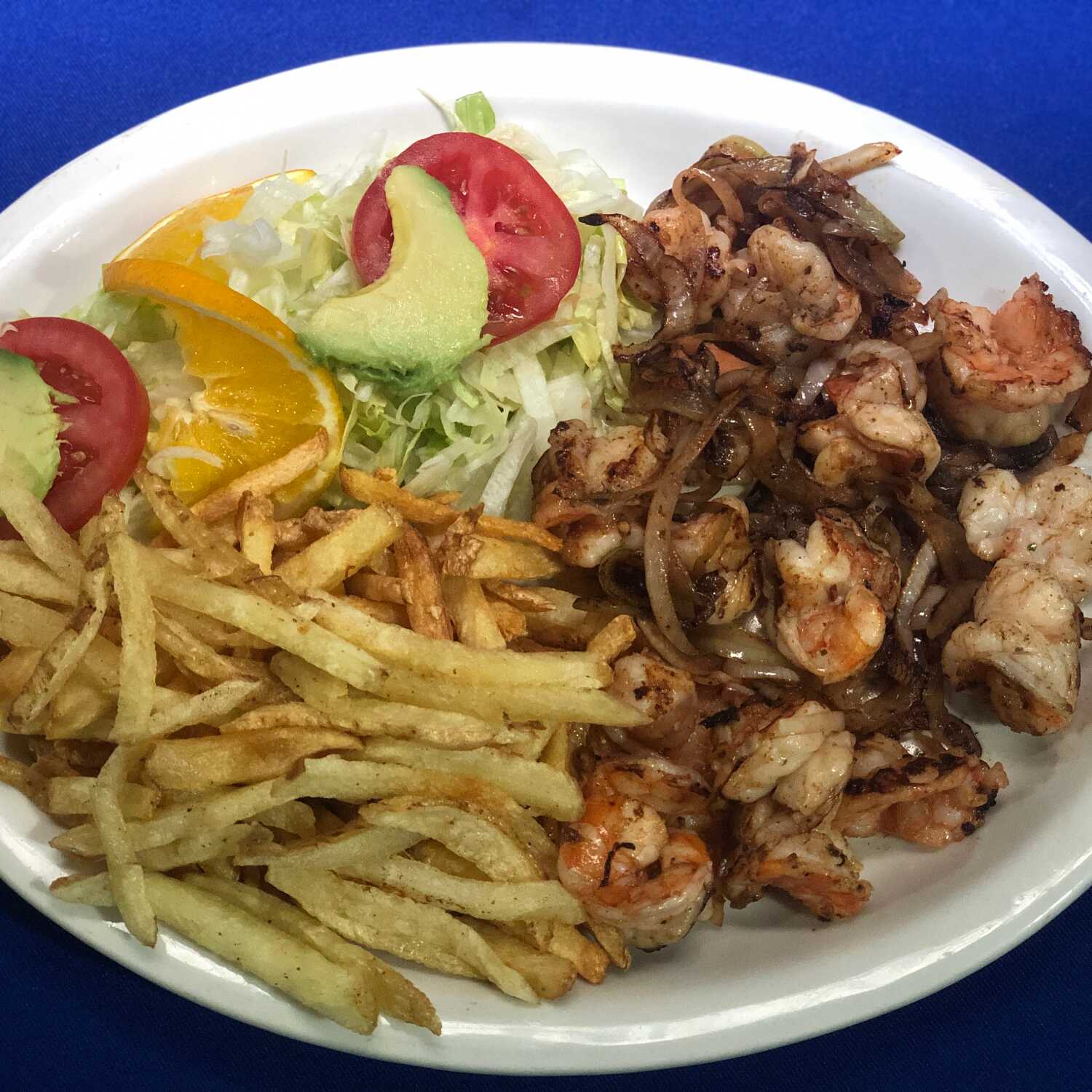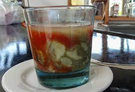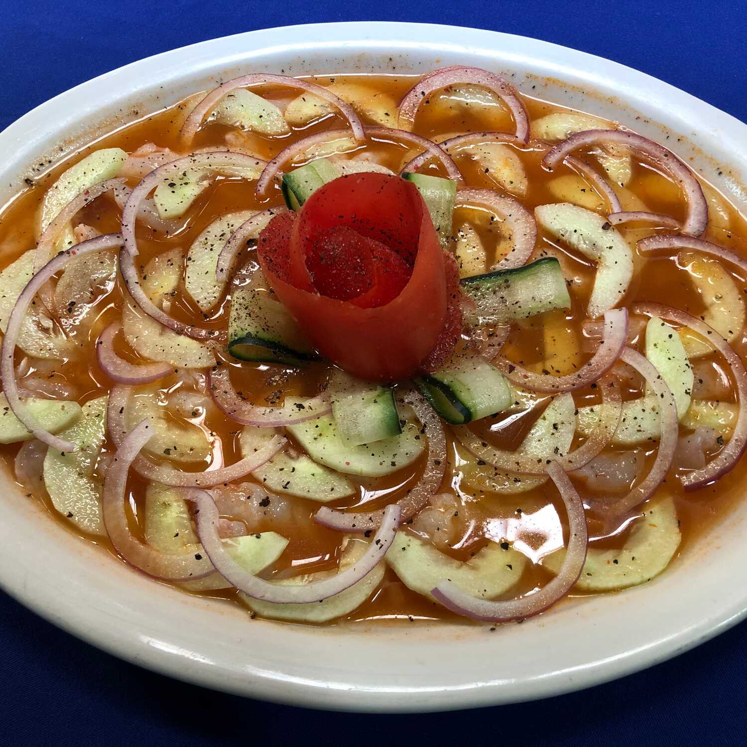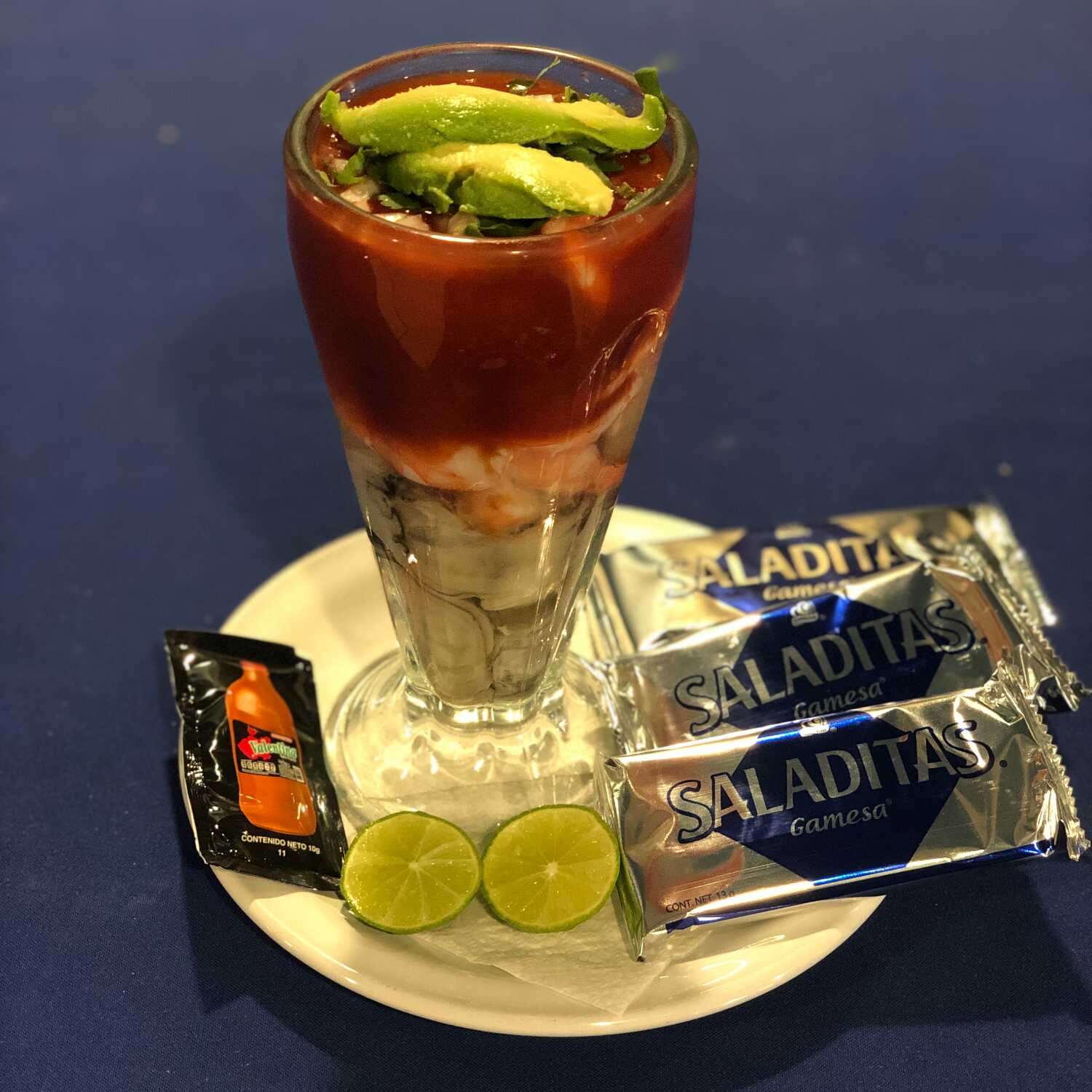 Camaron, Agua de Ostion, Cebolla, Jitomate, Chile Cuaresmeño, Cilantro y Aguacate