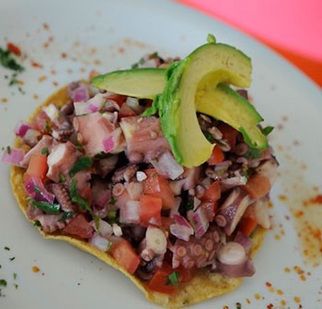 Ceviche con pulpo, jaiba, caracol, camaron, filete mero, cebolla, jitomate, chile, guajillo, chile cuaresmaño, aguacate y queso oaxaca