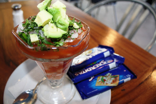 Ostion y Camaron catsup cebolla, cilantro y aguacate