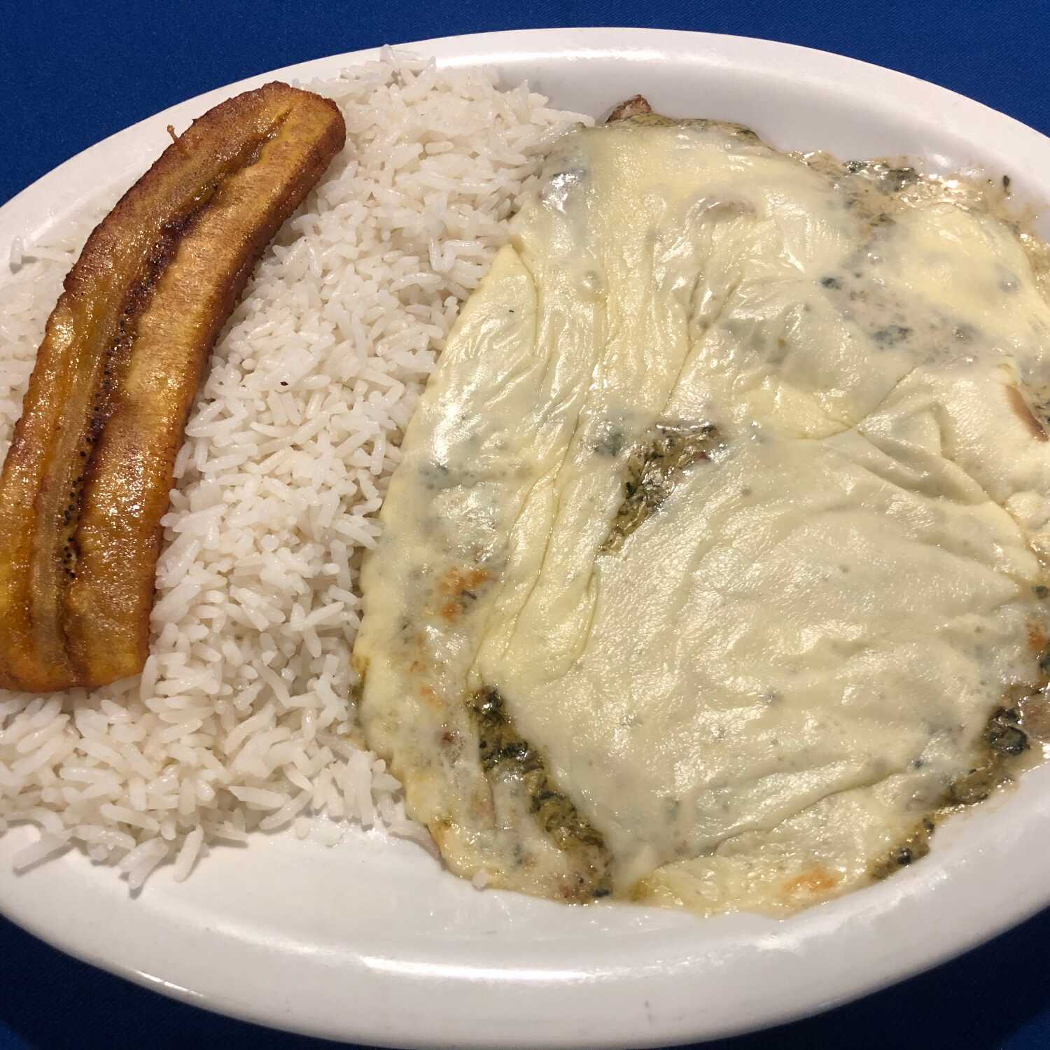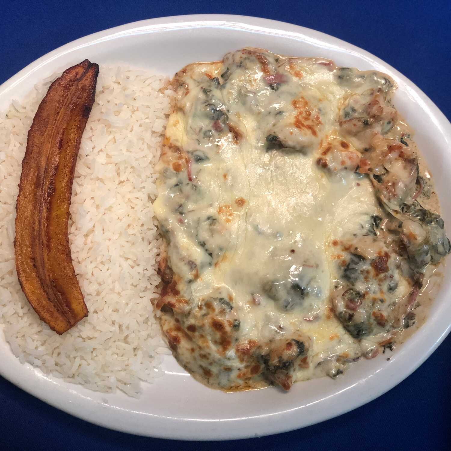 Filete bañado en crema de espinaca y tocino gratinado con queso manchego