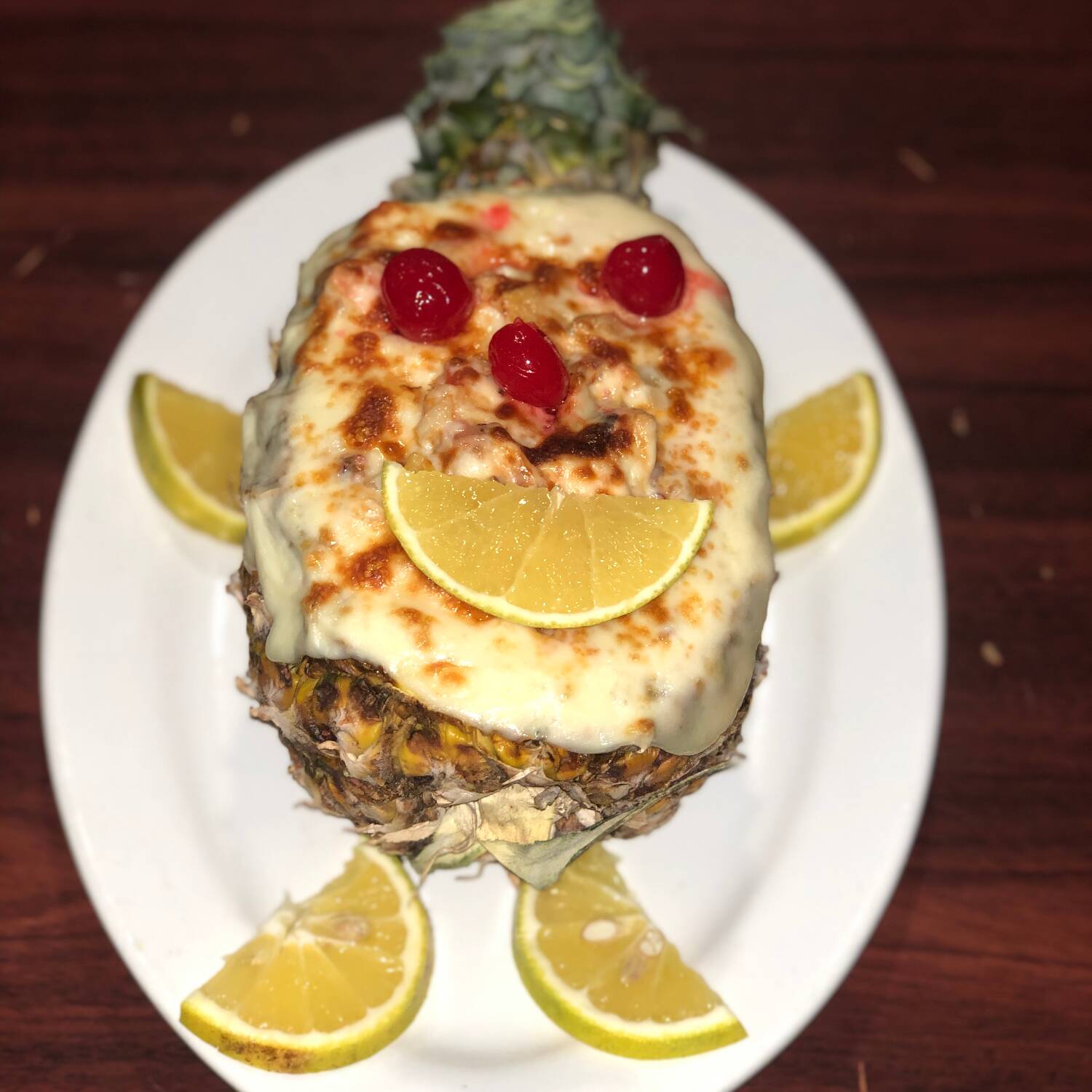 Deliciosa piña rellena de camaron, pulpo, jaiba y caracol guisada con crema y chile gratinada con queso manchego