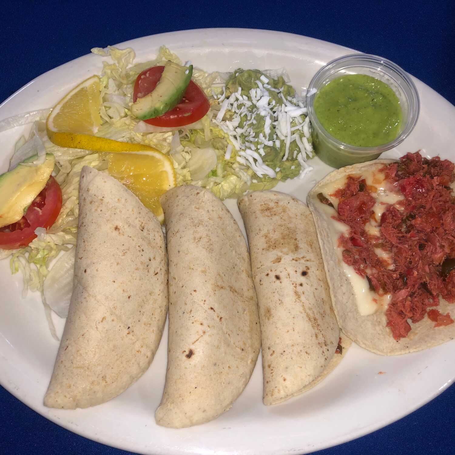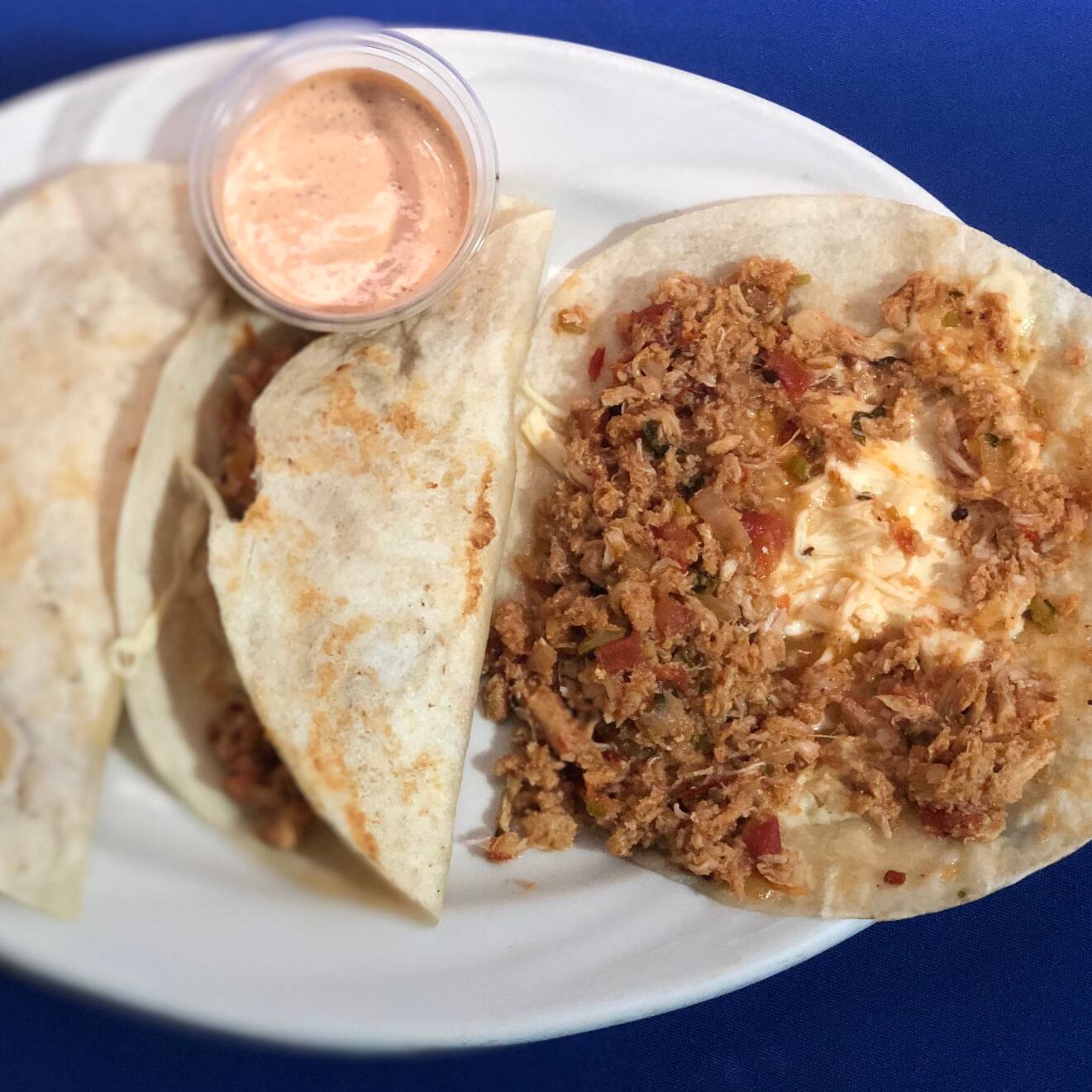 1 de Atun, 1 de Jaiba, 1 de Camaron, En tortilla de harina y queso oaxaca