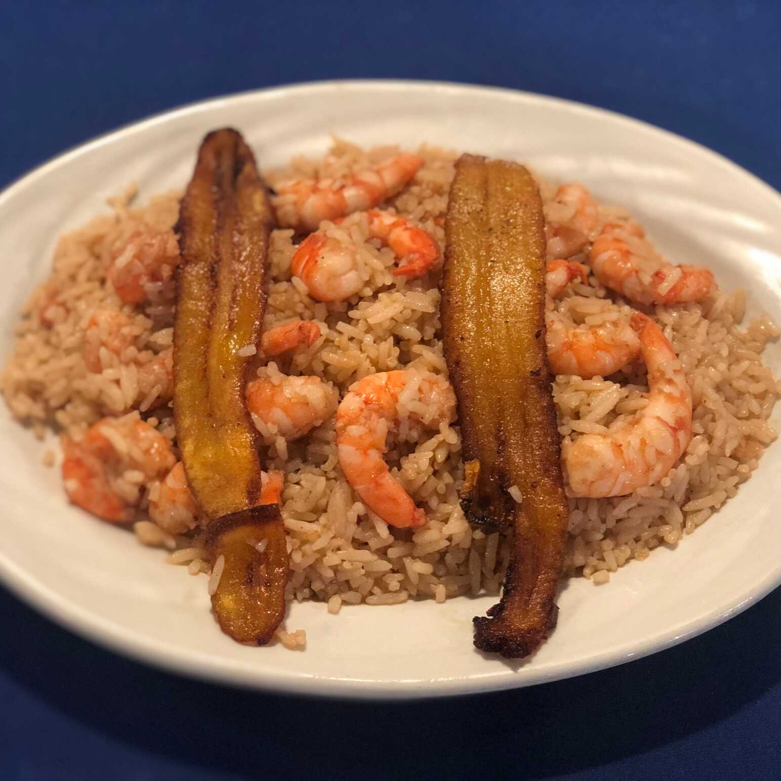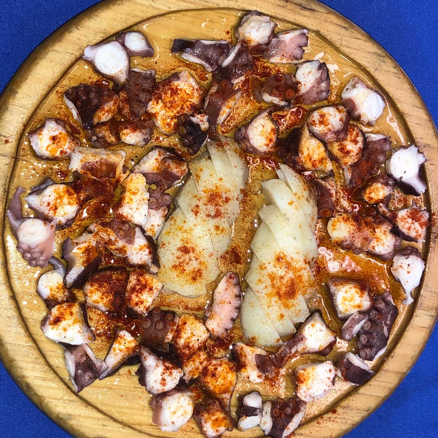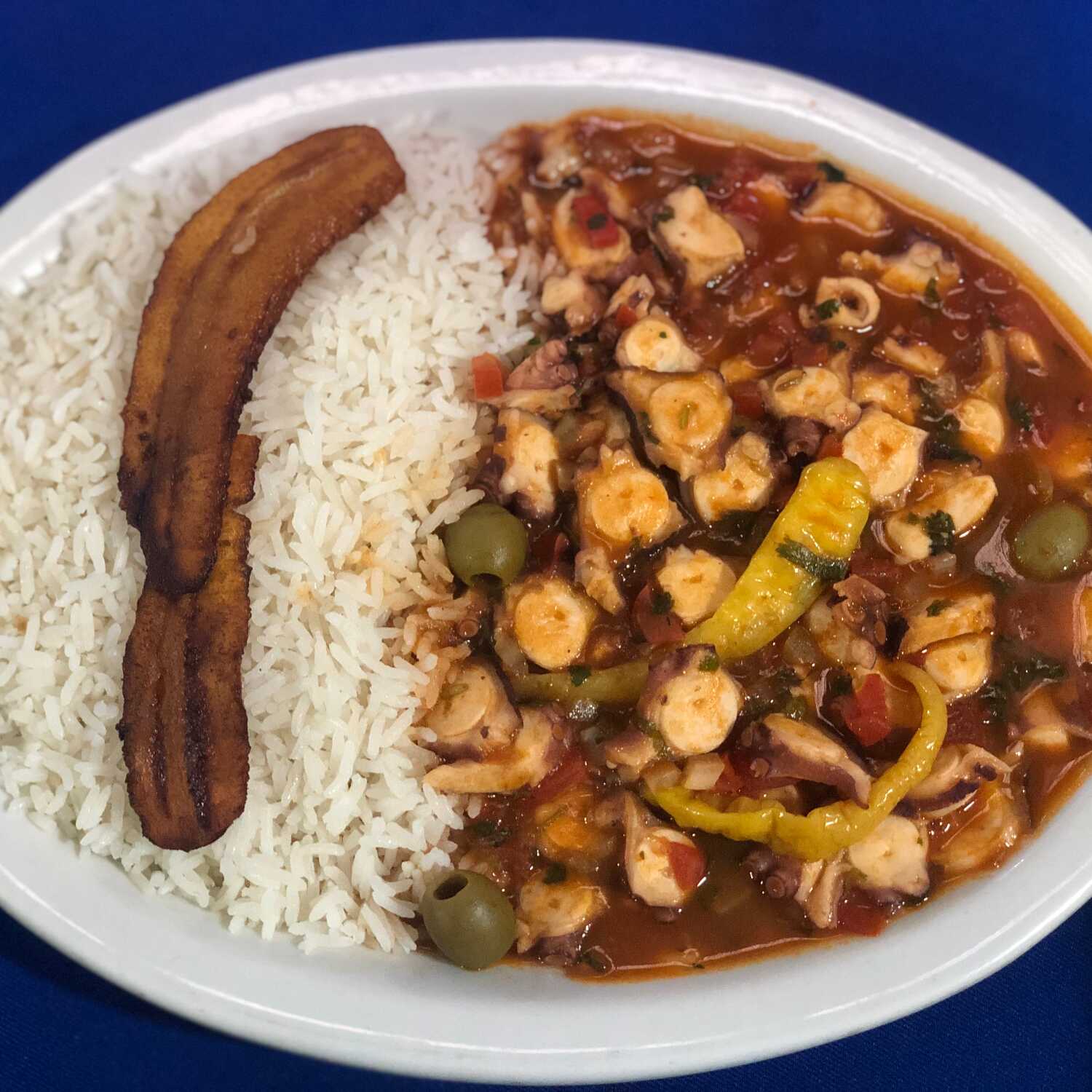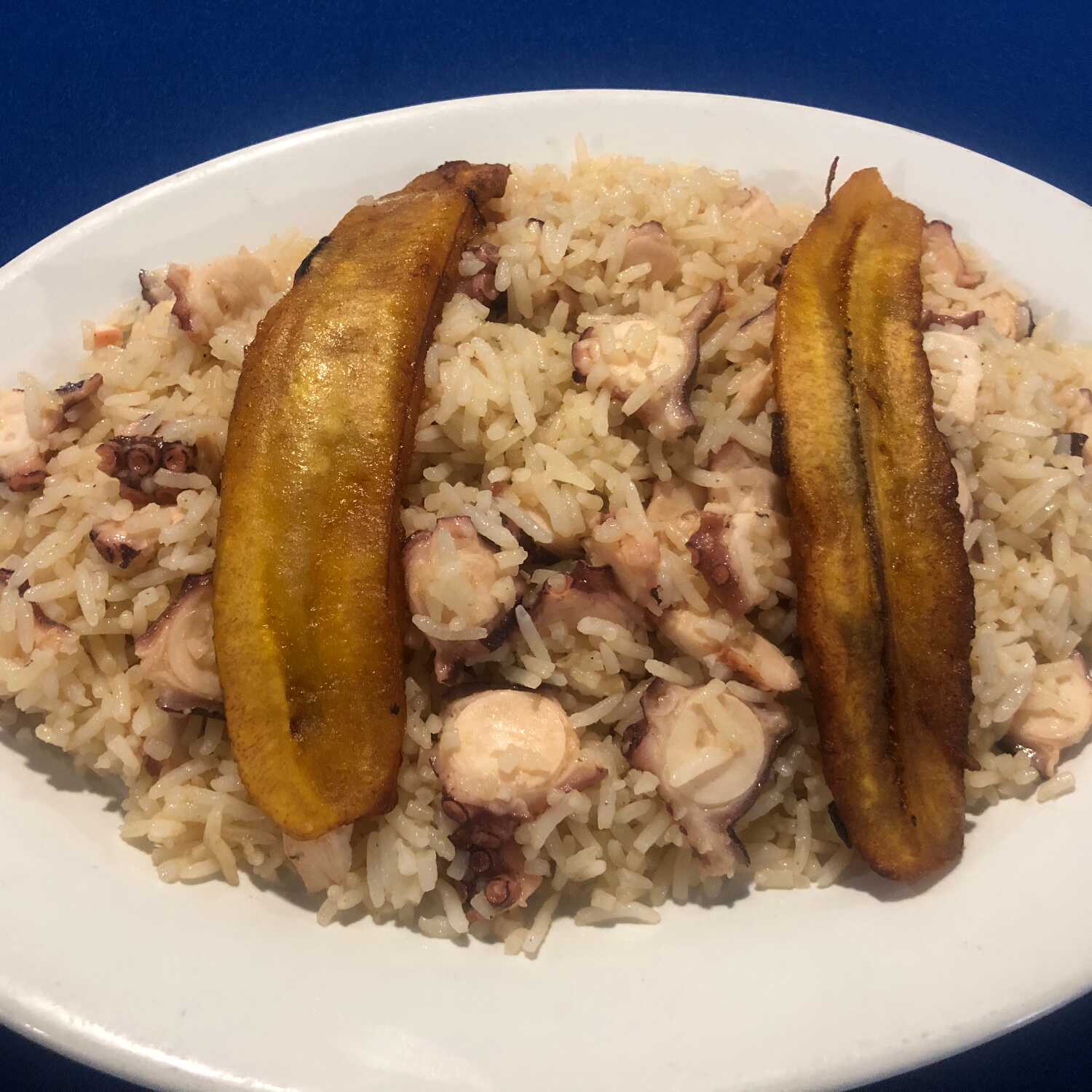 Platano macho con camaron y pulpo gratinado con queso manchego