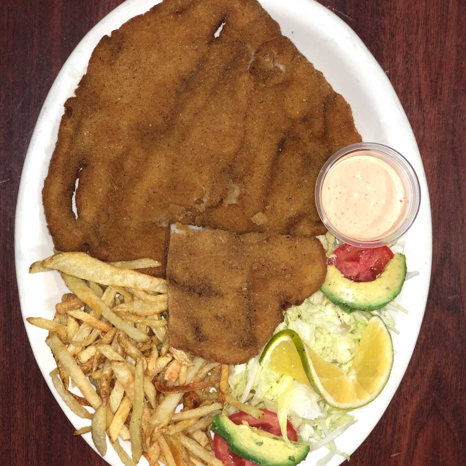 Filete al sarten son cebolla, cilantro, jitomate, aceitunas y chiles güeros