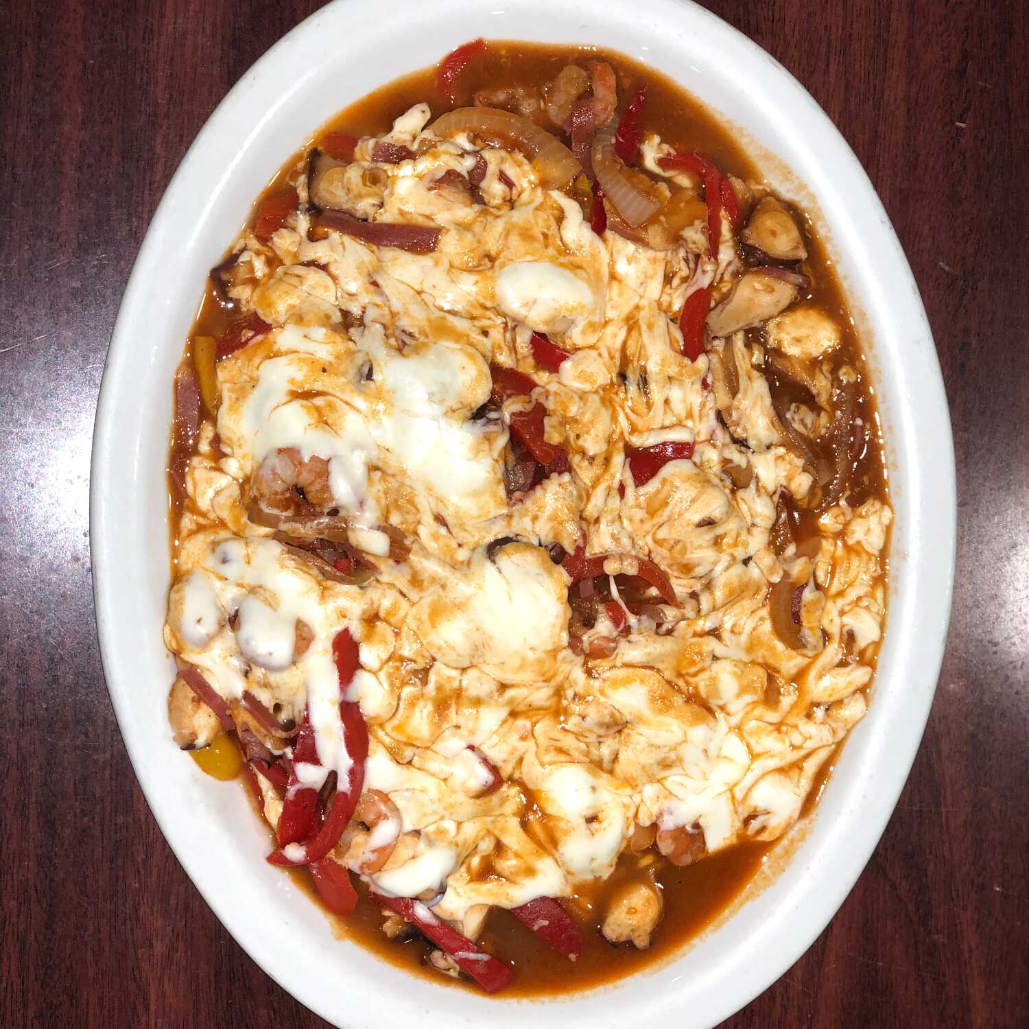Camaron, pulpo, cebolla, pimientos, tocino y gratinados con queso oaxaca