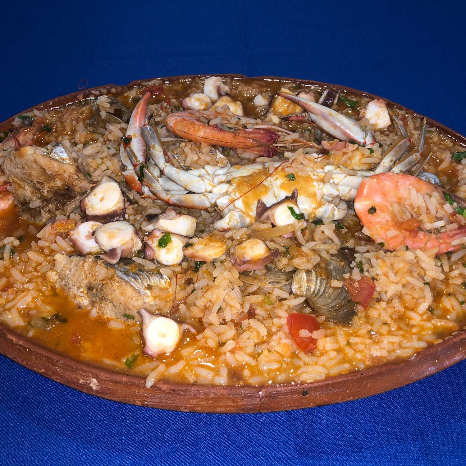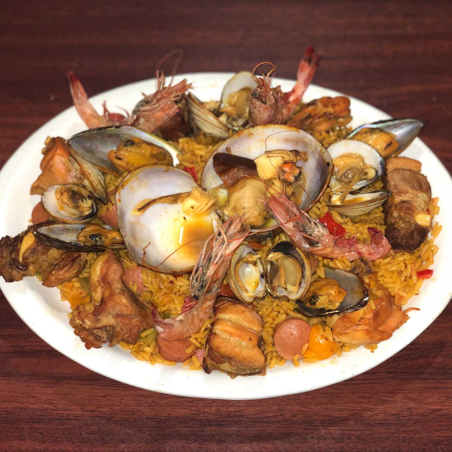 Deliciosa paella con mejillones, camarones, almeja, carne de cerdo, pollo, salschicha