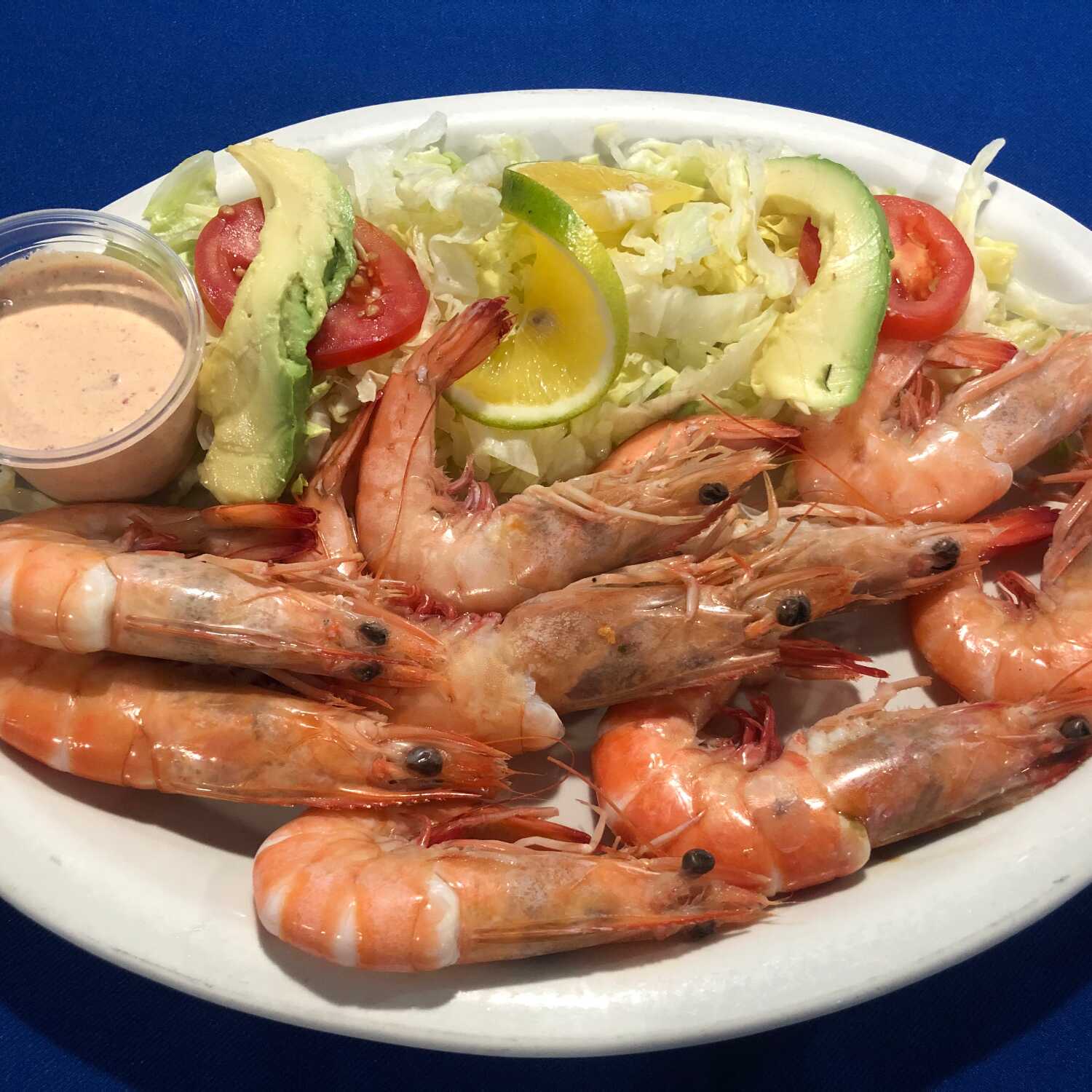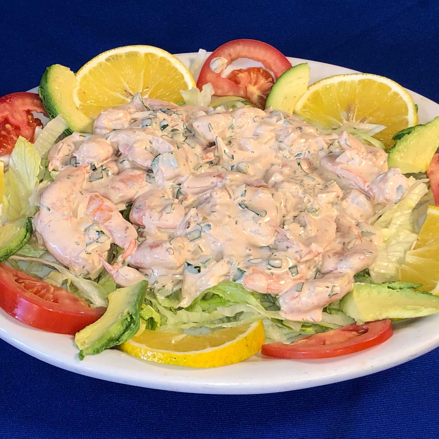 Delicioso camaron coctelero con mayonesa, crema, chipotle, perejil, chile cuaresmeño en una cama de lechuga