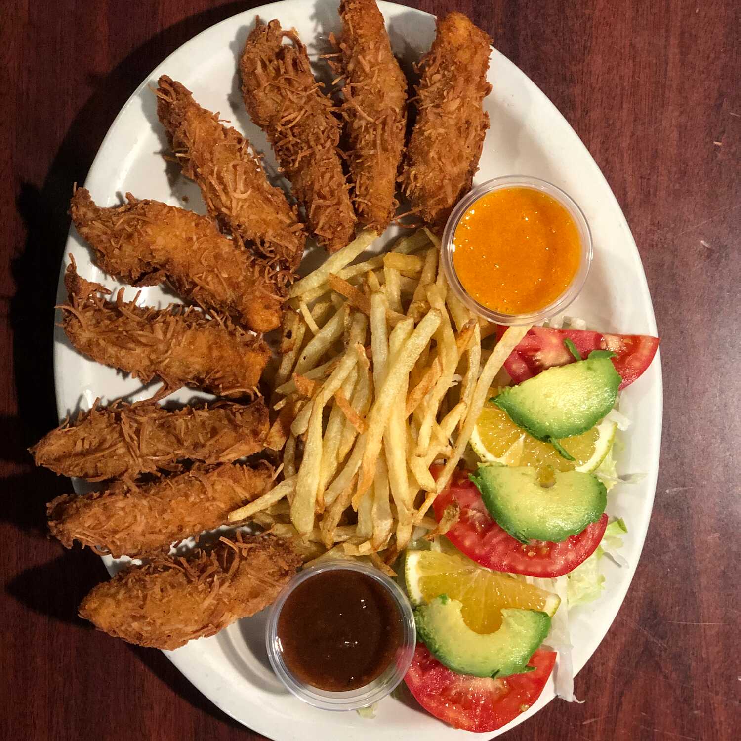 Camarones empanizados con ralladura de coco acompañados de salsa de mango y salsa de tamarindo (250gr aprox...)