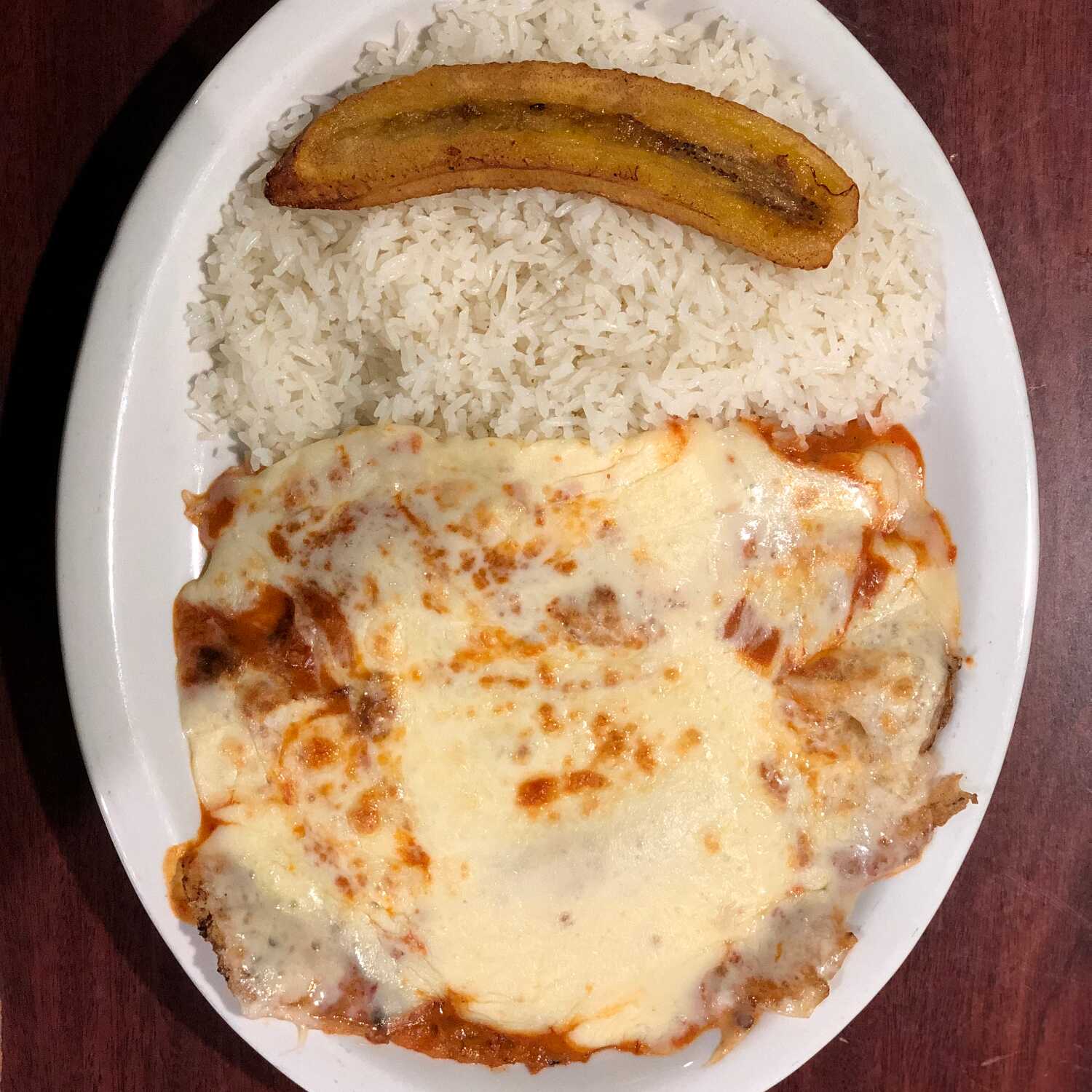 Filete bañanado en salsa diabla y gratinado con queso manchego