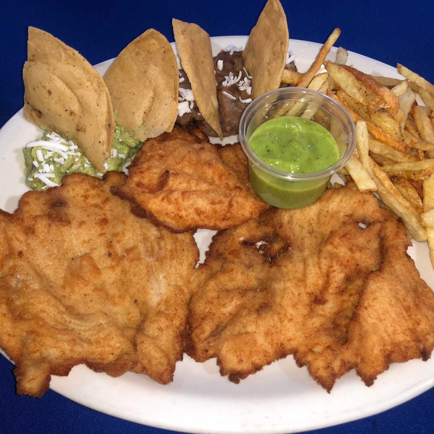 250 aprox... Pechuga de pollo acompañada de frijoles, guacamole, papas a la fransesa y salsa verde