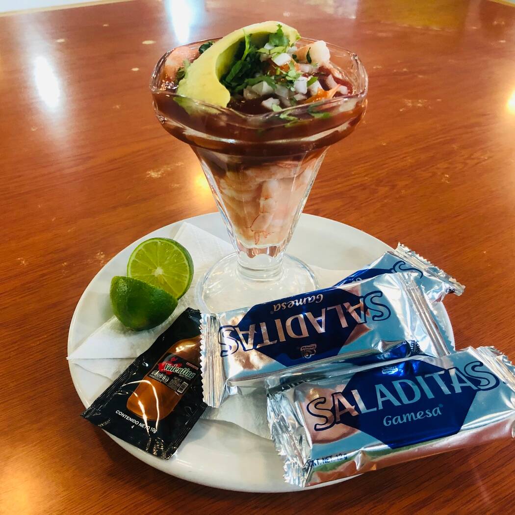 Camaron, Ostion, Catsup, Cebolla, Cilantro y Aguacate