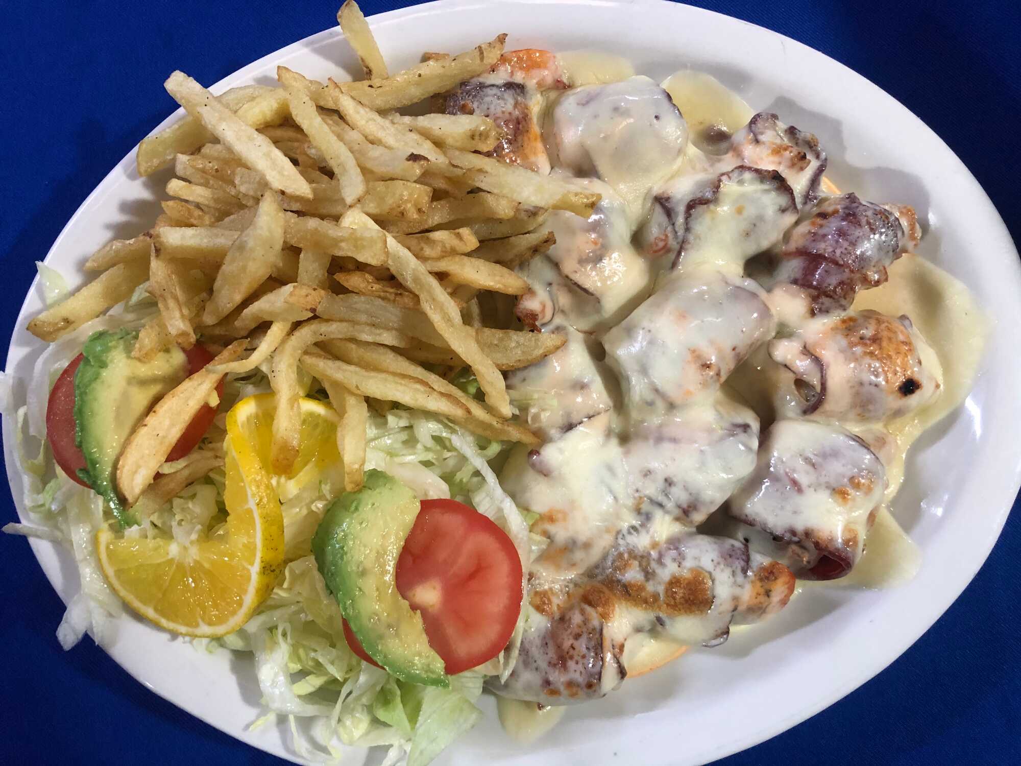 Filete con ceviche de Camaron, pulpo, jaiba, caracol y gratinado con queso manchego