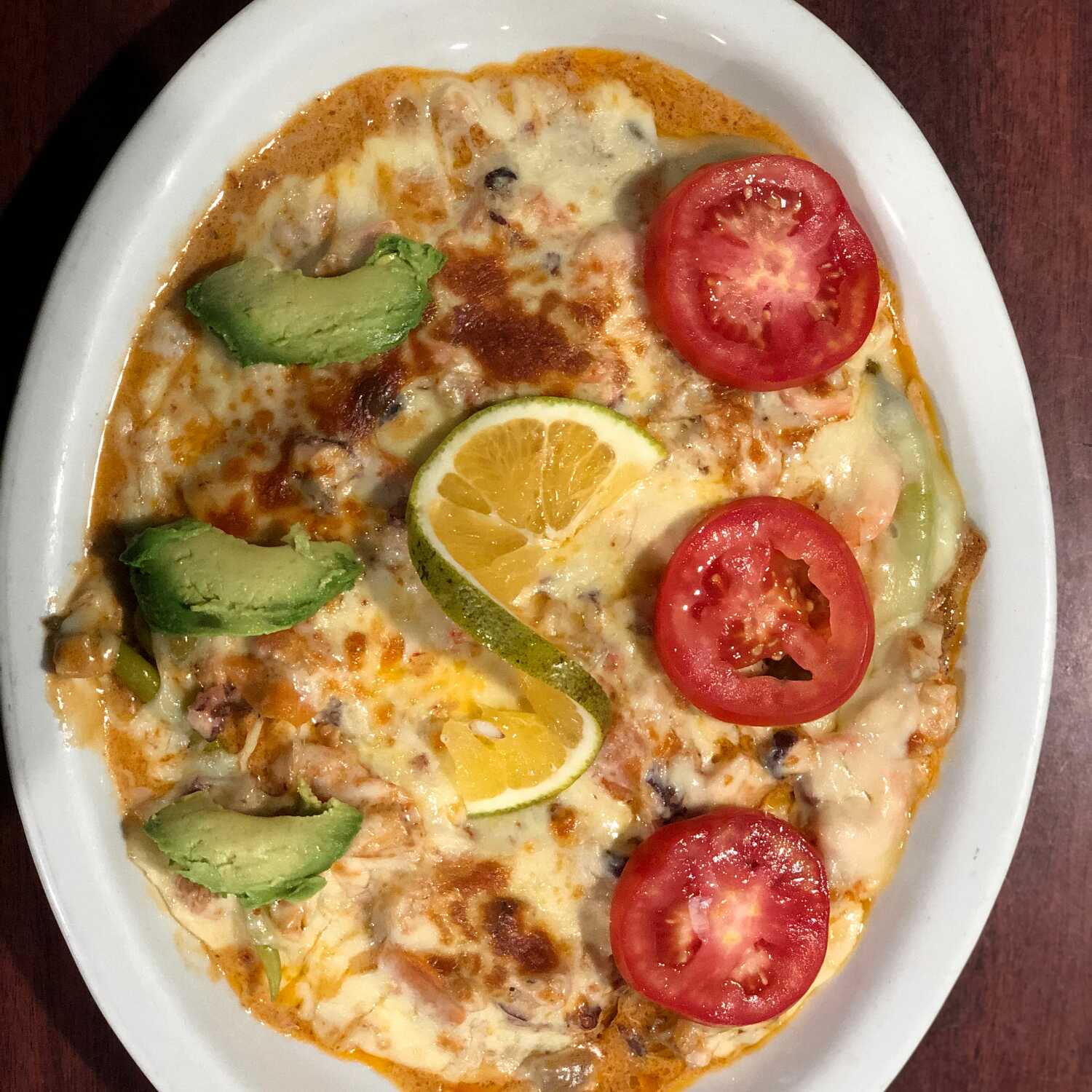 Filete con ceviche de camaron, pulpo, jaiba, caracol, zanahoria, aceitunas, chiles güeros y gratinado con queso manchego