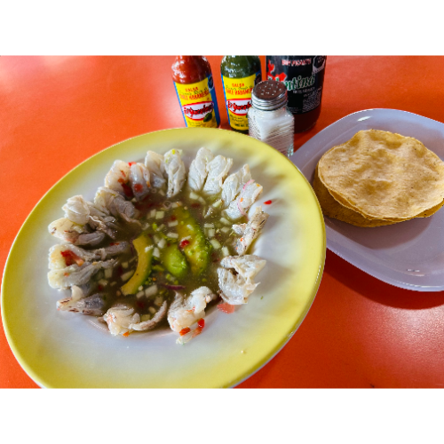 Camarón y Ostión con Cilantro, Cebolla y Aguacate